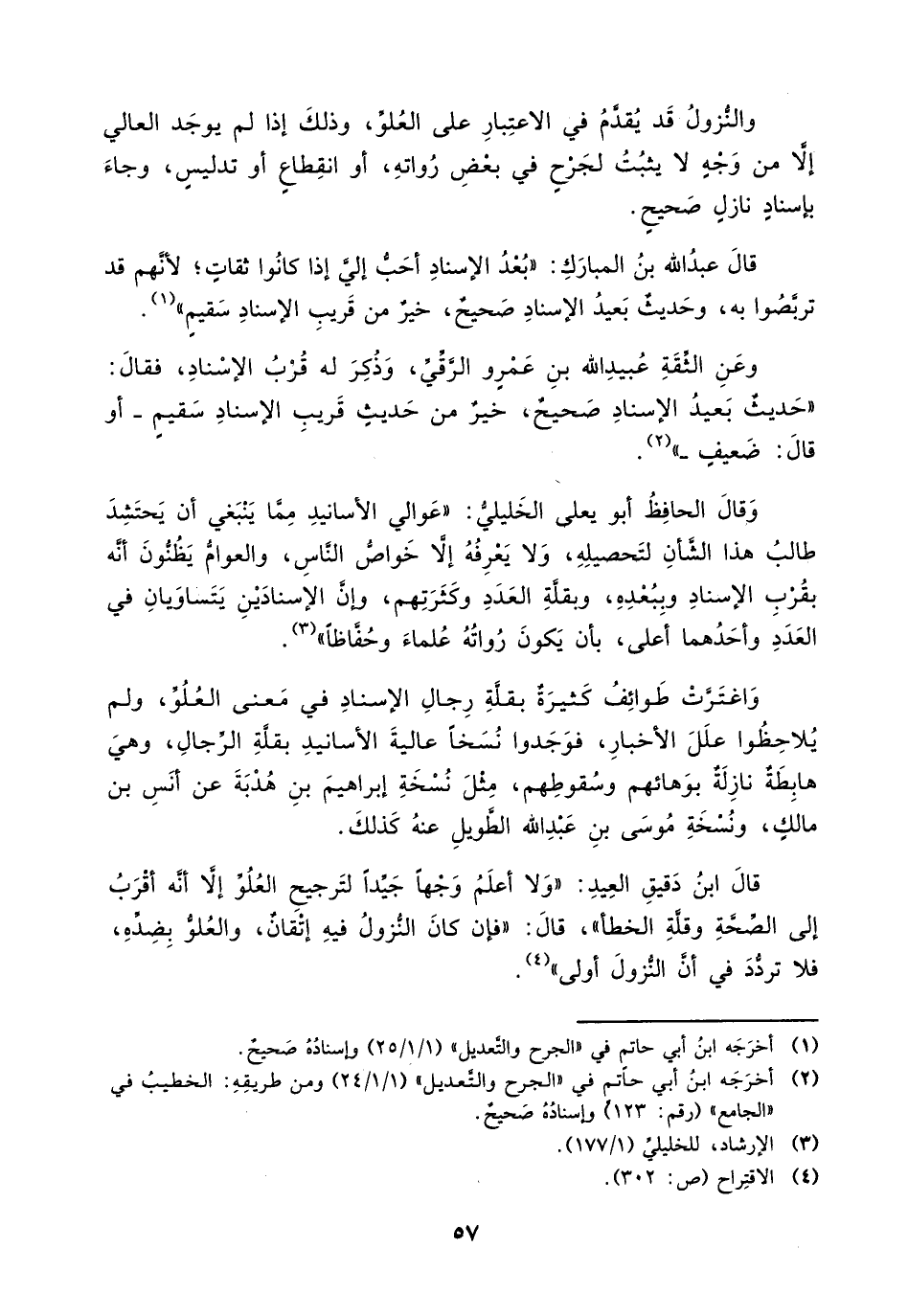 وقال الحافظ أبو يعلى الخليلي: " عوالي الأسانيد مما ينبغي أن يحتشد طالب هذا الشأن لتحصيله، ولا يعرفه إلا خواص الناس، والعوام يظنون أنه بقرب الإسناد وببعده، وبقلة العدد وكثرتهم، وإن الإسنادين يتساويان في العدد وأحدهما أعلى، بأن يكون رواته علماء وحفاظا " (¬3).