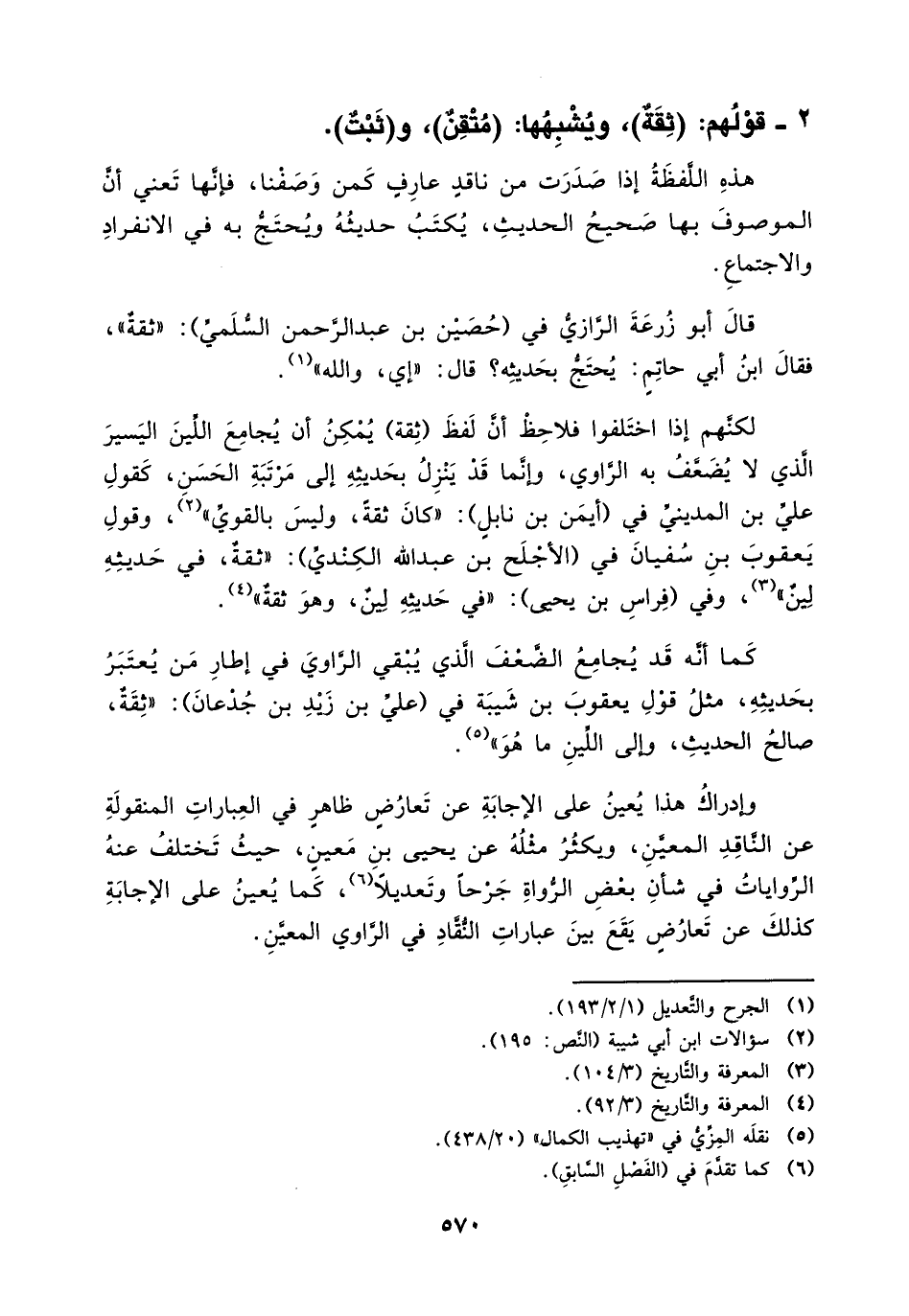 لكنهم إذا اختلفوا فلاحظ أن لفظ (ثقة) يمكن أن يجامع اللين اليسير الذي لا يضعف به الراوي، وإنما قد ينزل بحديثه إلى مرتبة الحسن، كقول علي بن المديني في (أيمن بن نابل): " كان ثقة، وليس بالقوي " (¬2)، وقول يعقوب بن سفيان في (الأجلح بن عبد الله الكندي): " ثقة، في حديثه لين " (¬3)، وفي (فراس بن يحيى): " في حديثه لين، وهو ثقة " (¬4).