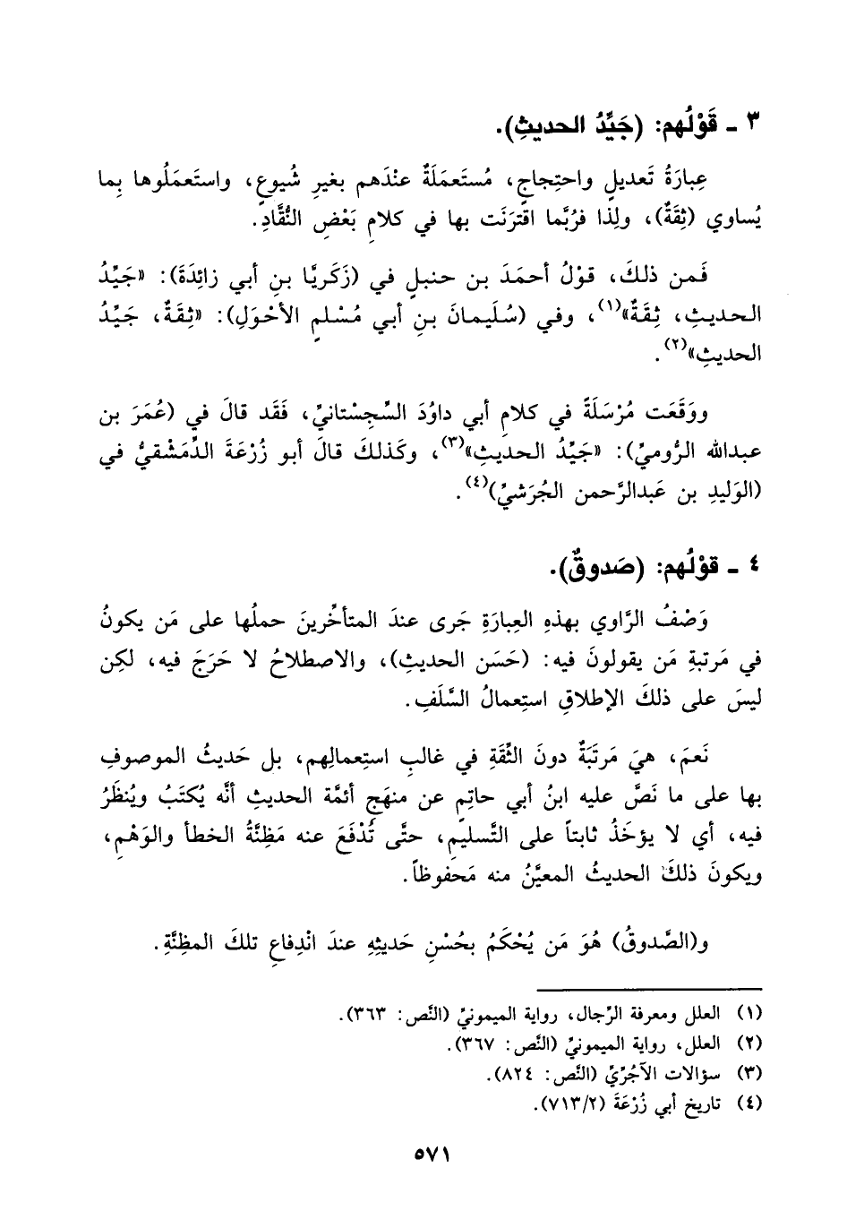 ووقعت مرسلة في كلام أبي داود السجستاني، فقد قال في (عمر بن عبد الله الرومي): " جيد الحديث " (¬3)، وكذلك قال أبو زرعة الدمشقي في (الوليد بن عبد الرحمن الجرشي) (¬4).