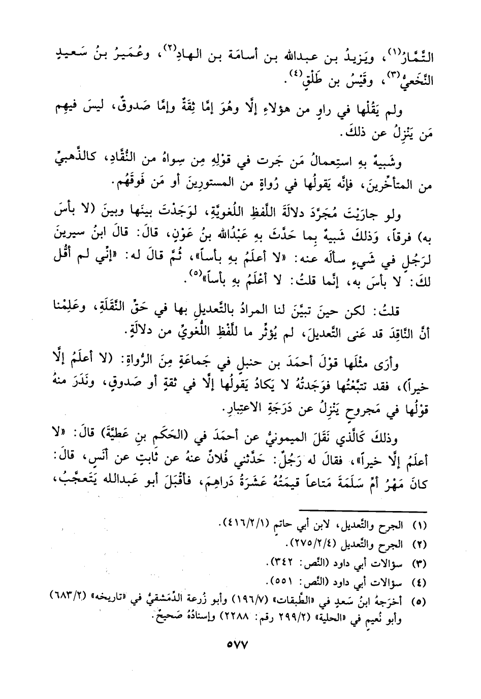 ولو جاريت مجرد دلالة اللفظ اللغوية، لوجدت بينها وبين (لا بأس به) فرقاً، وذلك شبيه بما حدث به عبد الله بن عون، قال: قال ابن سيرين لرجل في شيء سأله عنه: " لا أعلم به بأساً "، ثم قال له: " إني لم أقل لك: لا بأس به، إنما قلت: لا أعلم به بأساً " (¬5).