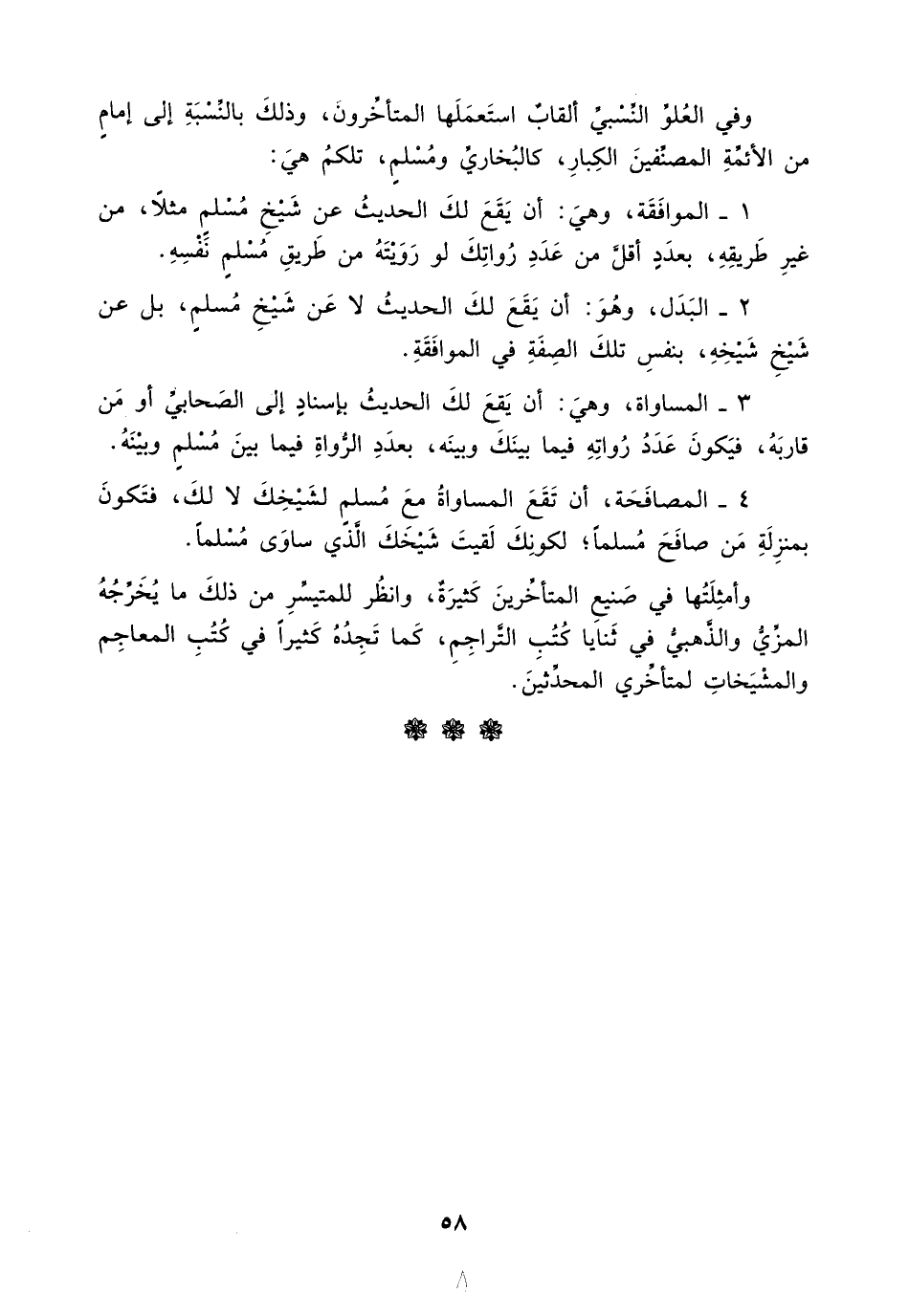 وفي العلو النسبي ألقاب استعملها المتأخرون، وذلك بالنسبة إلى إمام من الأئمة المصنفين الكبار، كالبخاري ومسلم، تلكم هي: