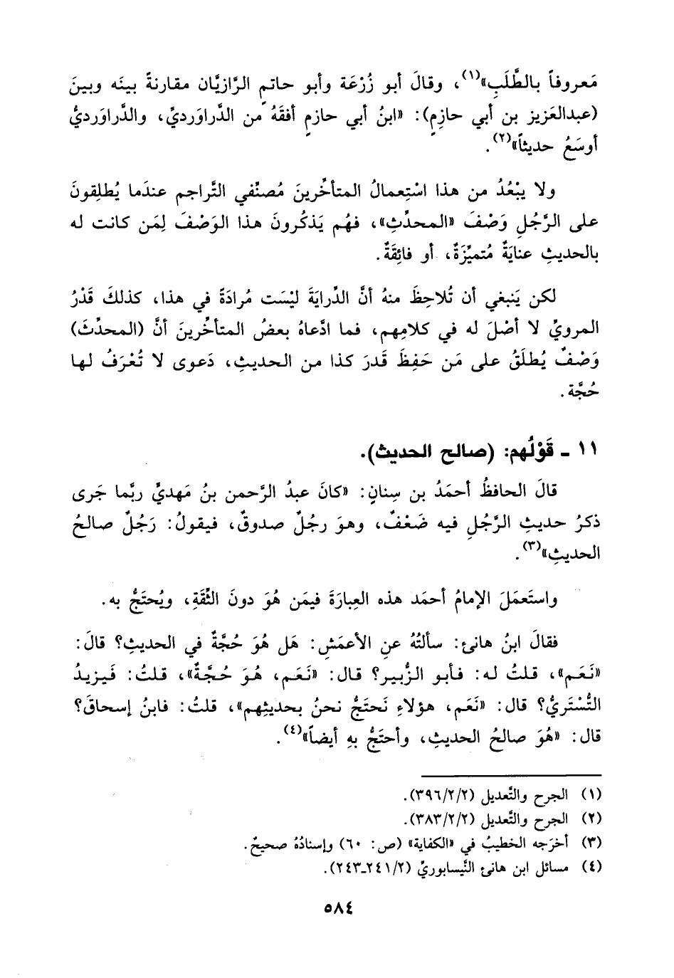 قال الحافظ أحمد بن سنان: " كان عبد الرحمن بن مهدي ربما جرى ذكر حيث الرجل فيه ضعف، وهو رجل صدوق، فيقول: رجل صالح الحديث " (¬3).