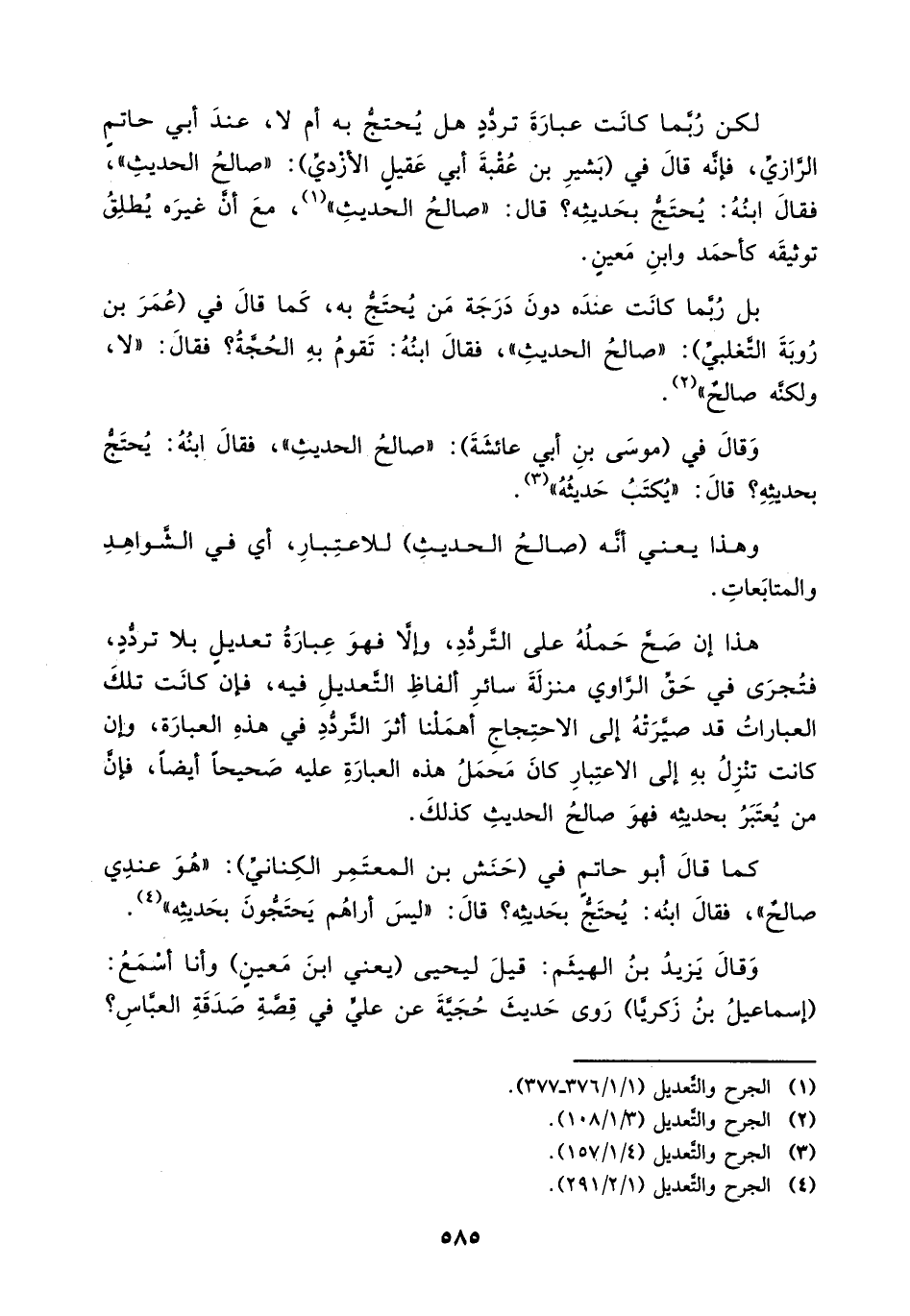 هذا إن صح حمله على التردد، وإلا فهو عبارة تعديل بلا تردد، فتجرى في حق الراوي منزلة سائر ألفاظ التعديل فيه، فإن كانت تلك العبارات قد صيرته إلى الاحتجاج أهملنا أثر التردد في هذه العبارة، وإن كانت تنزل به إلى الاعتبار كان محمل هذه العبارة عليه صحيحاً أيضاً، فإن من يعتبر بحديثه فهو صالح الحديث كذلك.
