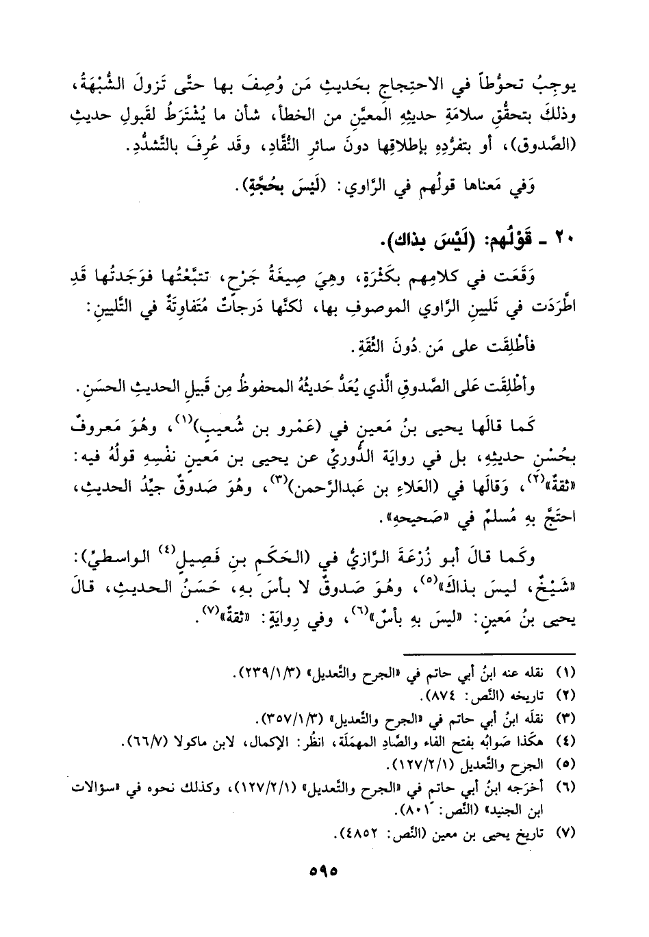 كما قالها يحيى بن معين في (عمرو بن شعيب) (¬1)، وهو معروف بحسن حديثه، بل في رواية الدوري عن يحيى بن معين نفسه قوله فيه: " ثقة " (¬2)، وقالها في (العلاء بن عبد الرحمن) (¬3)، وهو صدوق جيد الحديث، احتج به مسلم في " صحيحه ".