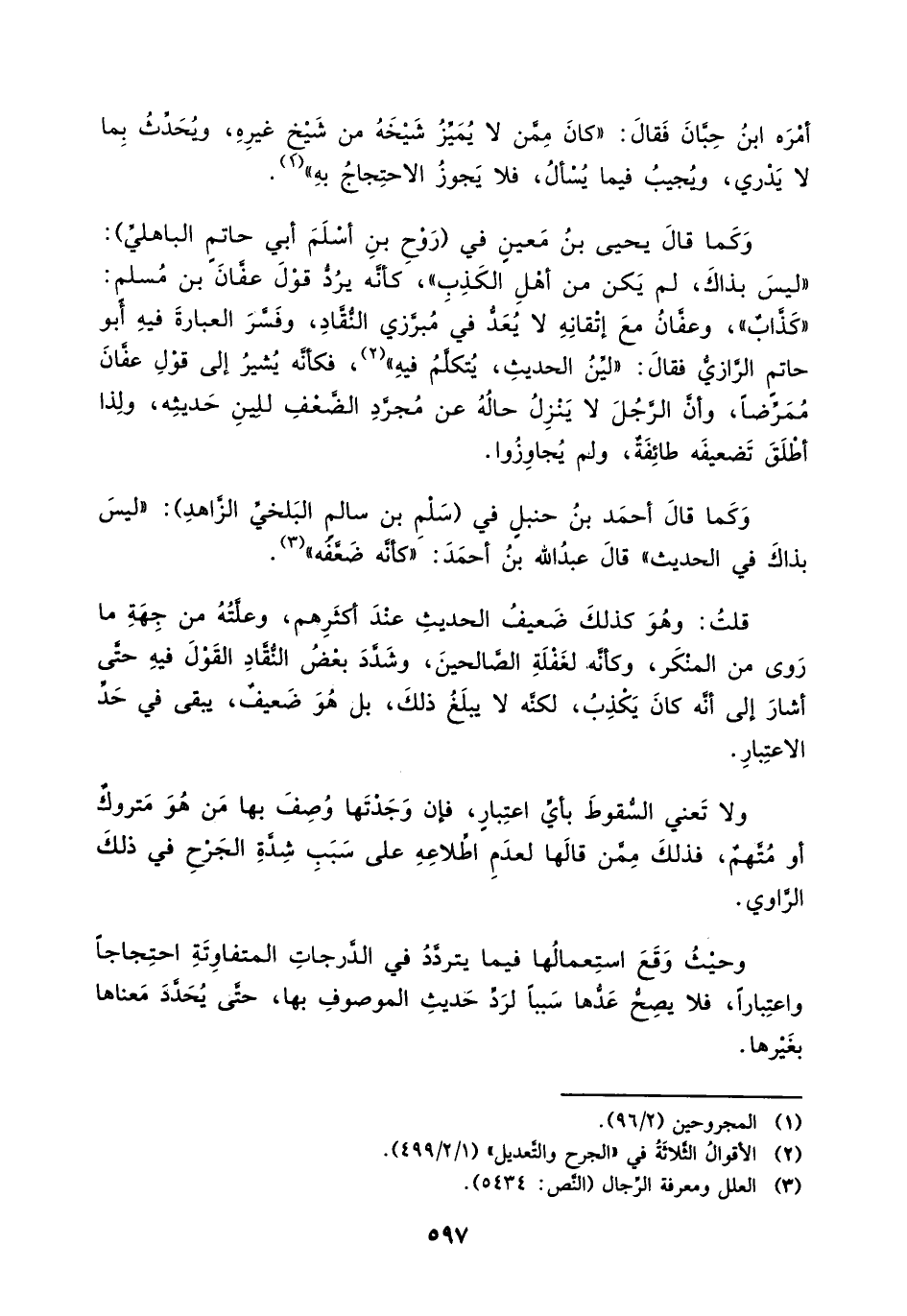 وحيث وقع استعمالها فيما يتردد في الدرجات المتفاوتة احتجاجاً واعتباراً، فلا يصح عدها سبباً لرد حديث الموصوف بها، حتى يحدد معناها بغيرها.