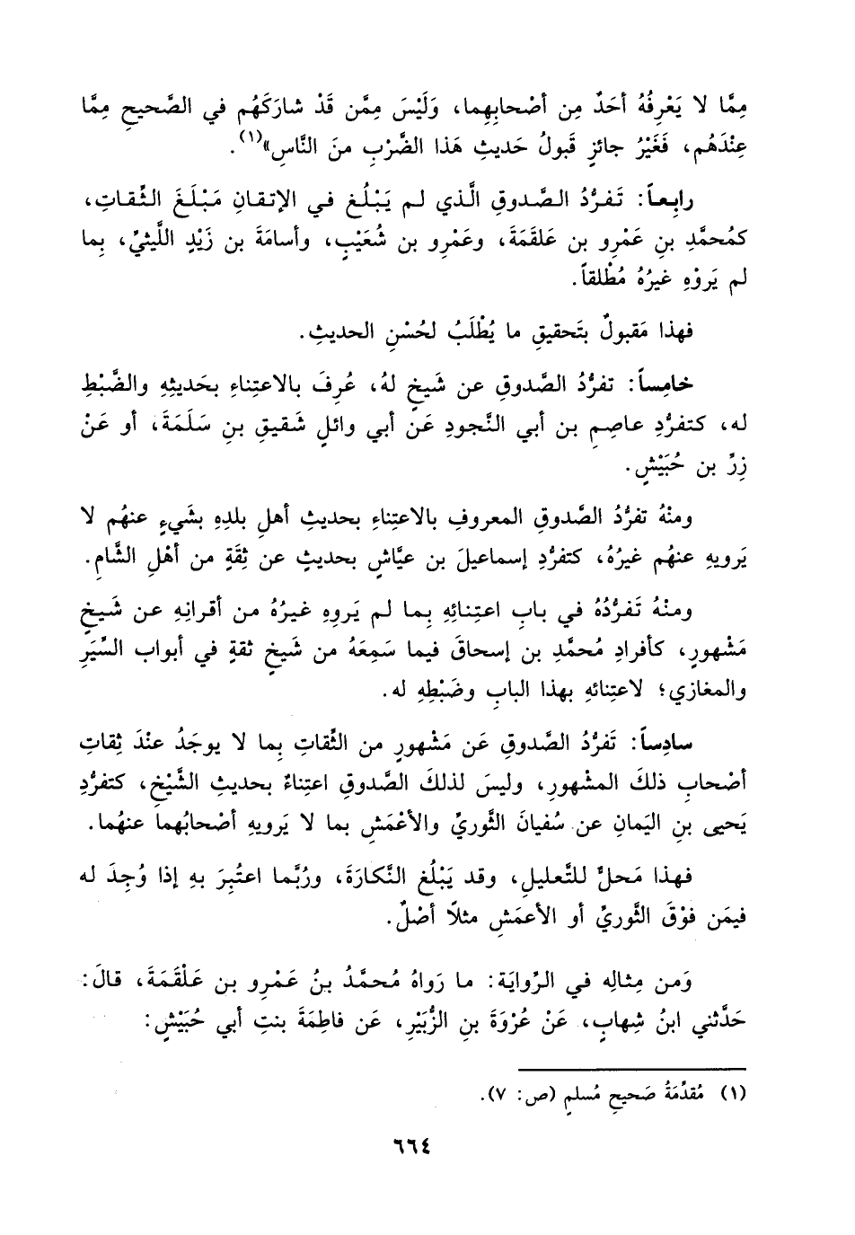 رابعاً: تفرد الصدوق الذي لم يبلغ في الإتقان مبلغ الثقات، كمحمد بن عمرو بن عَلْقَمَة، وعمر بن شعيب، وأسامة بن زيد اللَّيثي، بما لم يروه غيره مطلقاً.
