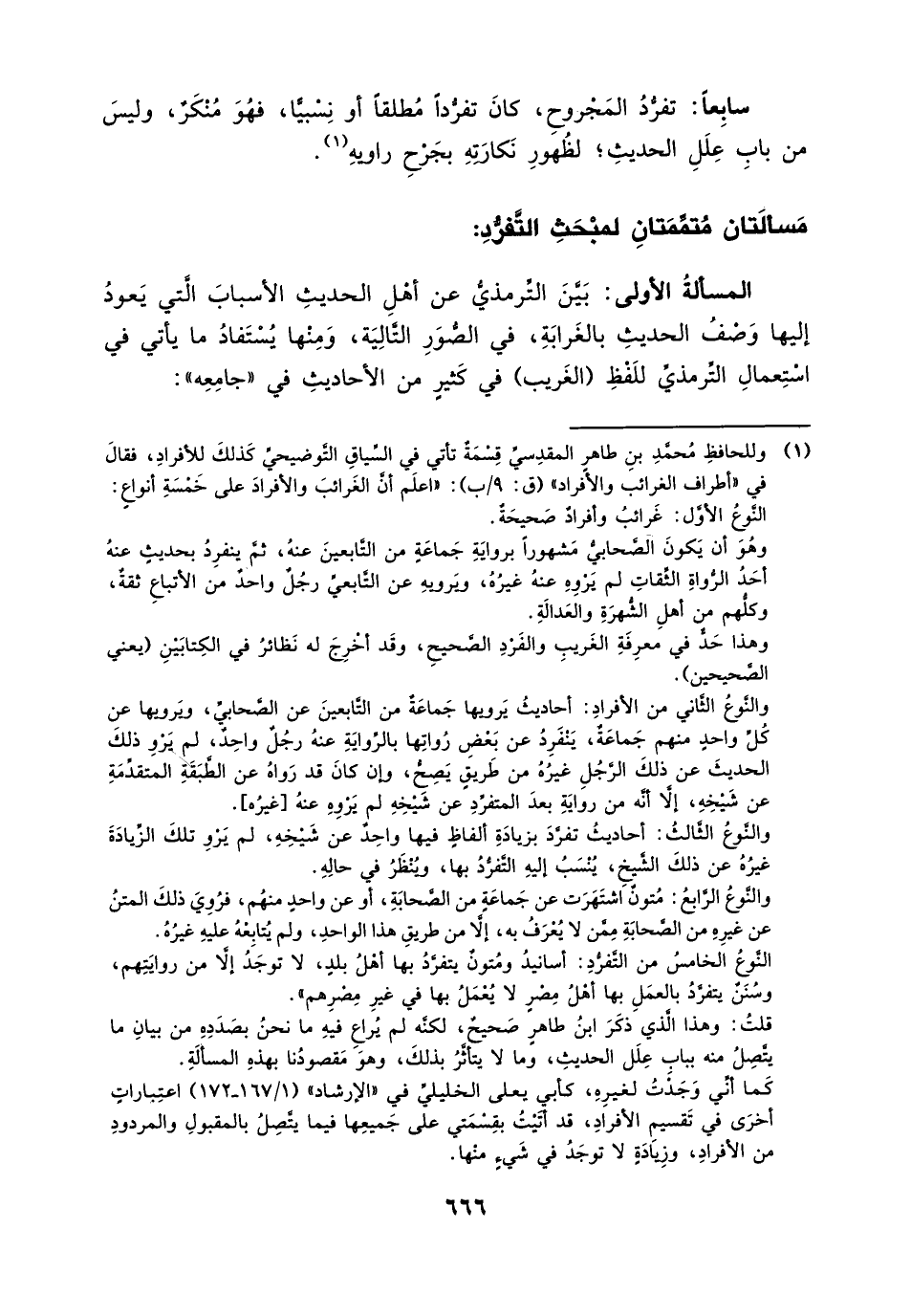 (¬1) وللحافظ محمد بن طاهر المقدسي قسمة تأتي في السياق التوضيحي كذلك للأفراد، فقال في " أطراف الغرائب والأفراد " (ق: 9 / ب): " اعلم أن الغرائب والأفراد على خمسة أنواع: