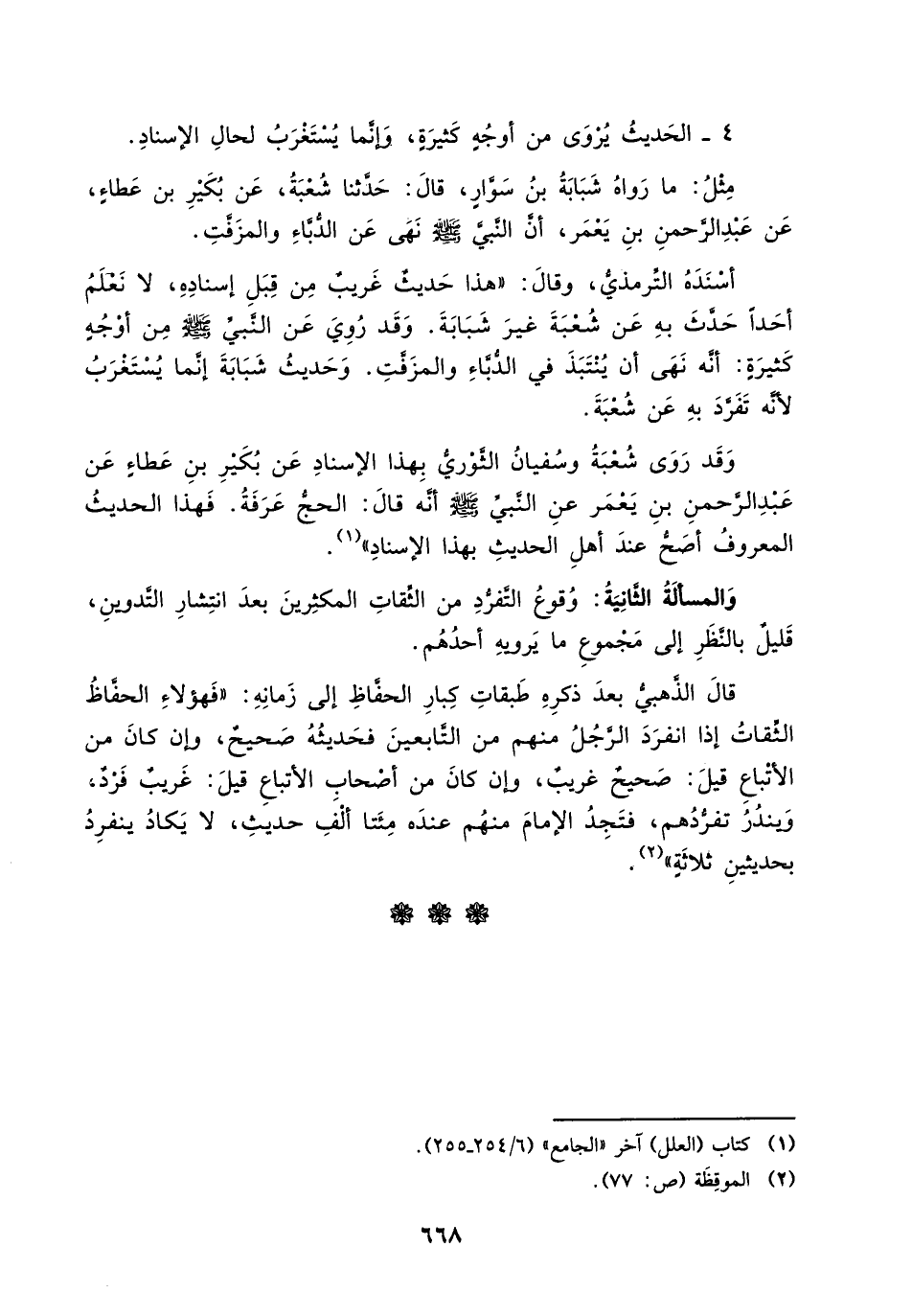 قال الذهبي بعد ذكره طبقات كبار الحفاظ إلى زمانه: " فهؤلاء الحفاظ الثقات إذا انفرد الرجل منهم من التابعين فحديثه صحيح، وإن كان من الأتباع قيل: صحيح غريب، وإن كان من أصحاب الأتباع قيل: غريب فرد، ويندر تفردهم، فتجد الإمام منهم عنده مِئَتا ألف حديث، لا يكاد ينفرد بحديثين ثلاثة " (¬2).