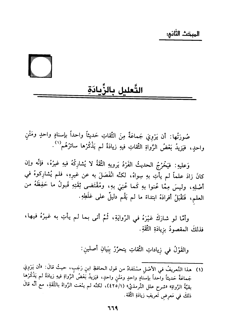(¬1) هذا التعريف في الأصل مستفاد من قول الحافظ ابن رجب، حيث قال: " أن يرويَ جماعة حديثاً واحداً بإسناد واحد ومتْن واحد، فيزيد بعض الرواة فيه زيادة لم يذكرها بقية الرواة " "شرح علل الترمذي " (1/ 425)، لكنه لم ينعت الرُّواة بالثقة، مع أنه قال ذلك في معرض تعريف زيادة الثقة.