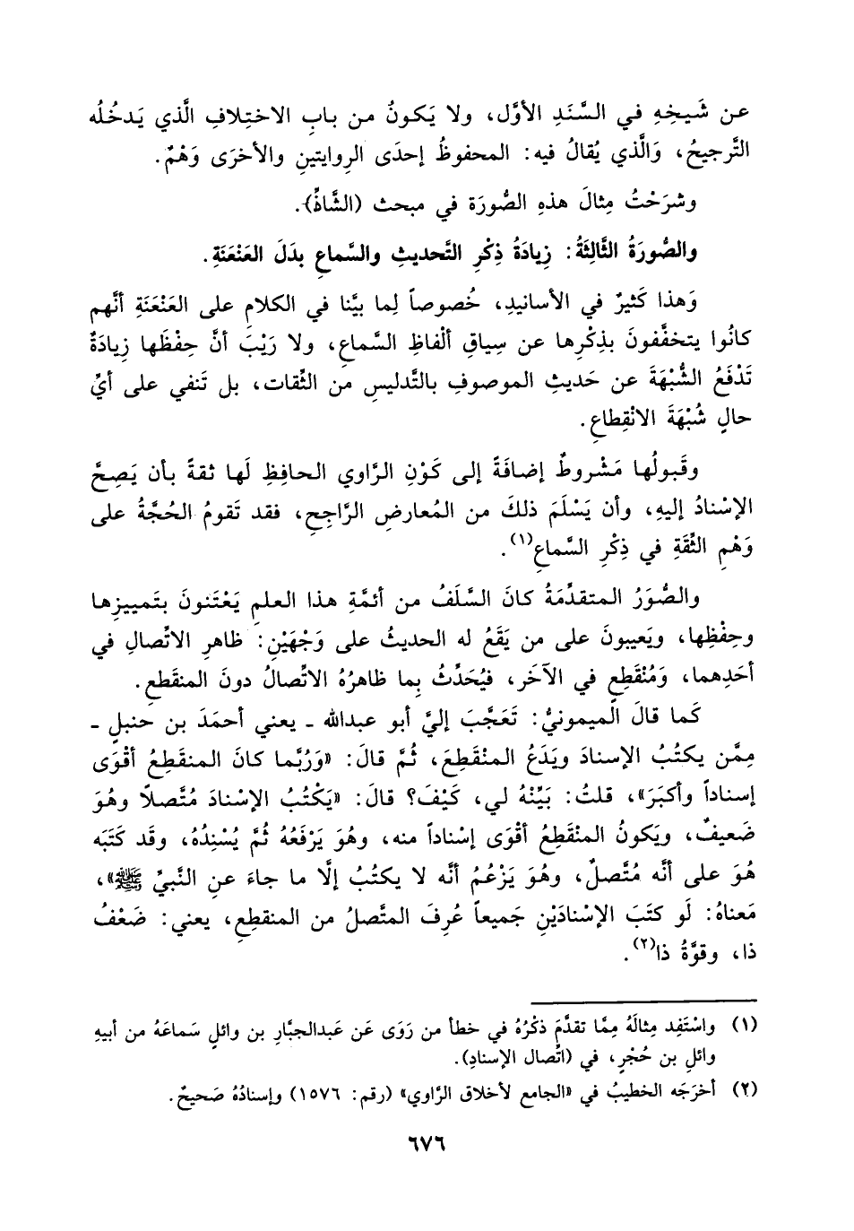 وهذا كثير في الأسانيد، خصوصاً لما بينا في الكلام على العنعنة أنهم كانوا يتخففون بذكرها عن سياق ألفاظ السماع، ولا ريب أن حفظها زيادة تدفع الشبهة عن حديث الموصوف بالتدليس من الثقات، بل تنفي على أي حال شبهة الانقطاع.