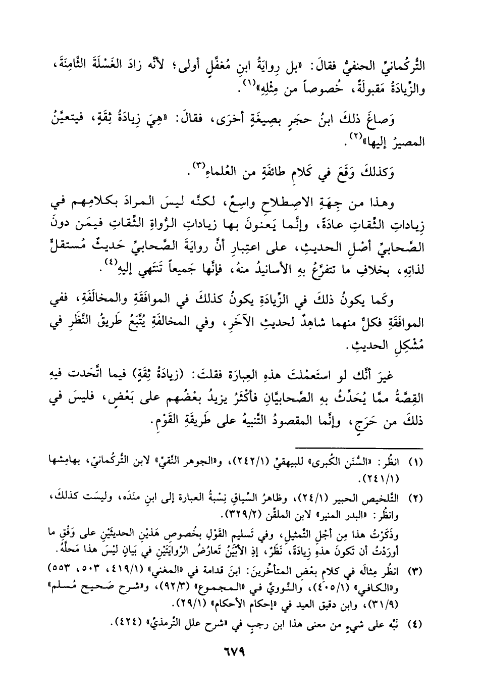 وهذا من جهة الاصطلاح واسع، لكنه ليس المراد بكلامهم في زيادات الثقات عادة، وإنما يعنون بها زيادات الرواة الثقات فيمن دون الصحابي أصل الحديث، على اعتبار أن رواية الصحابي حديث مستقل لذاتة، بخلاف ما تتفرع به الأسانيد منه، فإنها جميعاً تنتهي إليه (¬4).