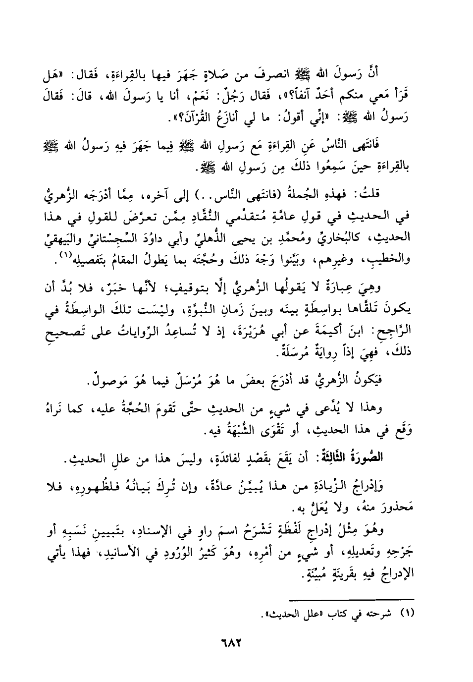 قلت: فهذه الجملة (فانتهى الناس. . ) إلى آخره، مما أدرجه الزهري في الحديث في قول عامة متقدمي النقاد ممن تعرض للقول في هذا الحديث، كالبخاري ومحمد بن يحيى الذهلي وأبي داود السجستاني والبيهقي والخطيب، وغيرهم، وبينوا وجه ذلك وحجته بما يطول المقام بتفصيله (¬1).