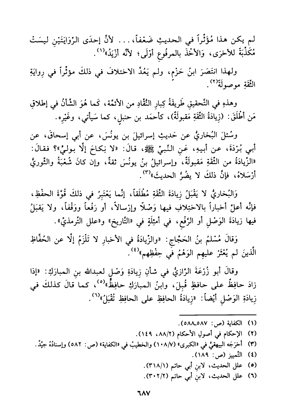 وهذه في التحقيق طريقة كبار النقاد من الأئمة، كما هو الشأن في إطلاق من أطلق: (زيادة الثقة مقبولة)، كأحمد بن حنبل، كما سيأتي، وغيره.