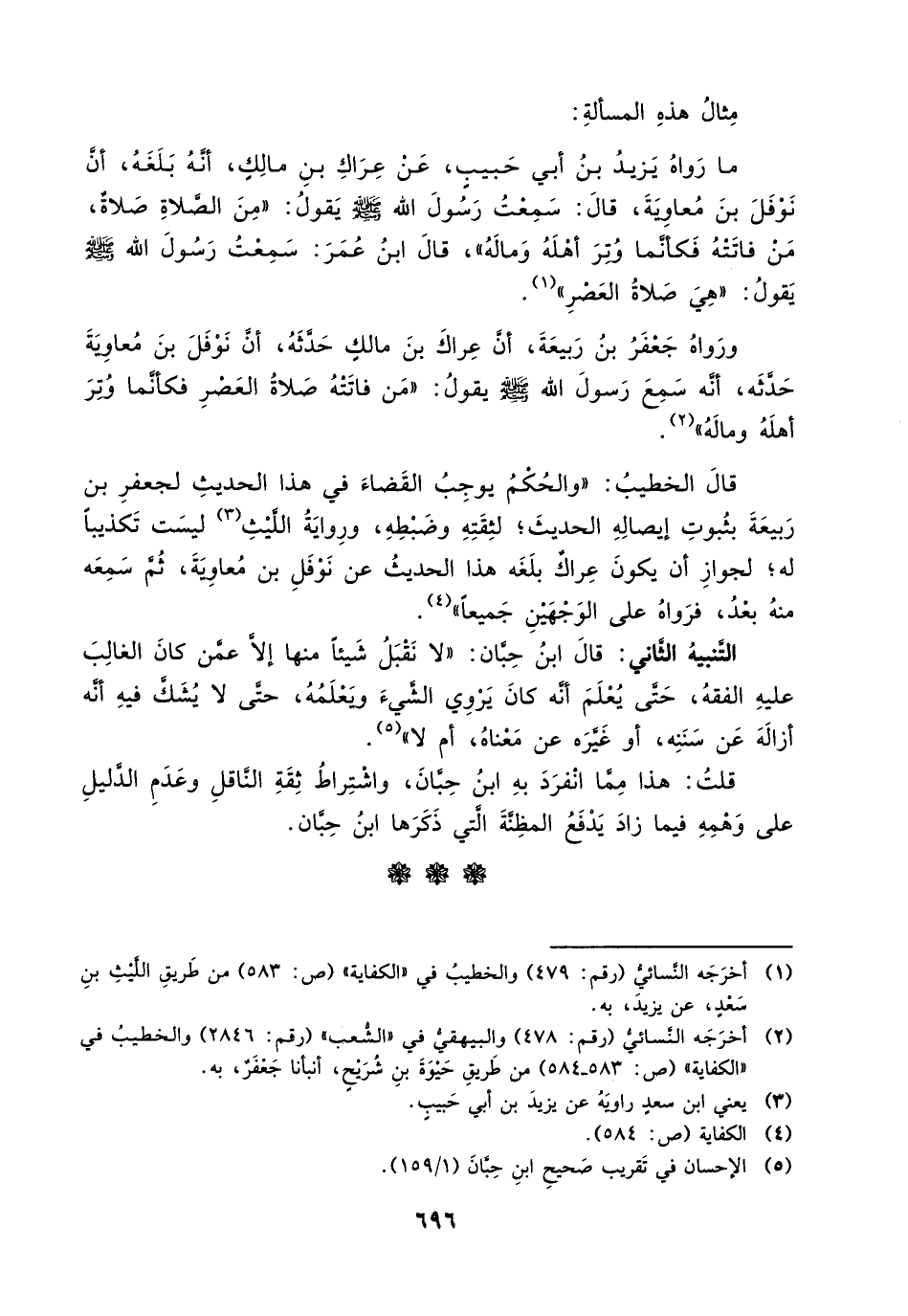 قال الخطيب: " والحُكم يوجب القَضاء في هذا الحديث لجعفر بن ربيعة بثبوت إيصاله الحديث؛ لثقته وضبطه، ورواية الليث (¬3) ليست تكذيباً له؛ لجواز أن يكون عِراك بلغه هذا الحديث عن نوفل بن معاوية، ثم سمعه منه بعد، فرواه على الوجهين جميعاً " (¬4).