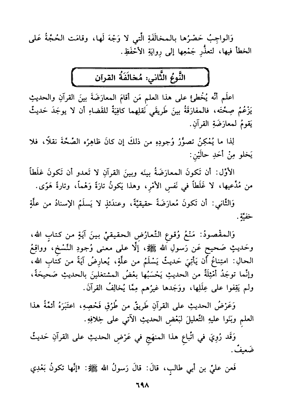 اعلم أنه يُخطئ على هذا العلم من أقام المعارضة بين القرآن والحديث يَزعم صِحته، فالمفارقة بين طريقي نقلهما كافيةٌ للقضاء أن لا يوجد حديث يقوم لمعارضة القرآن.