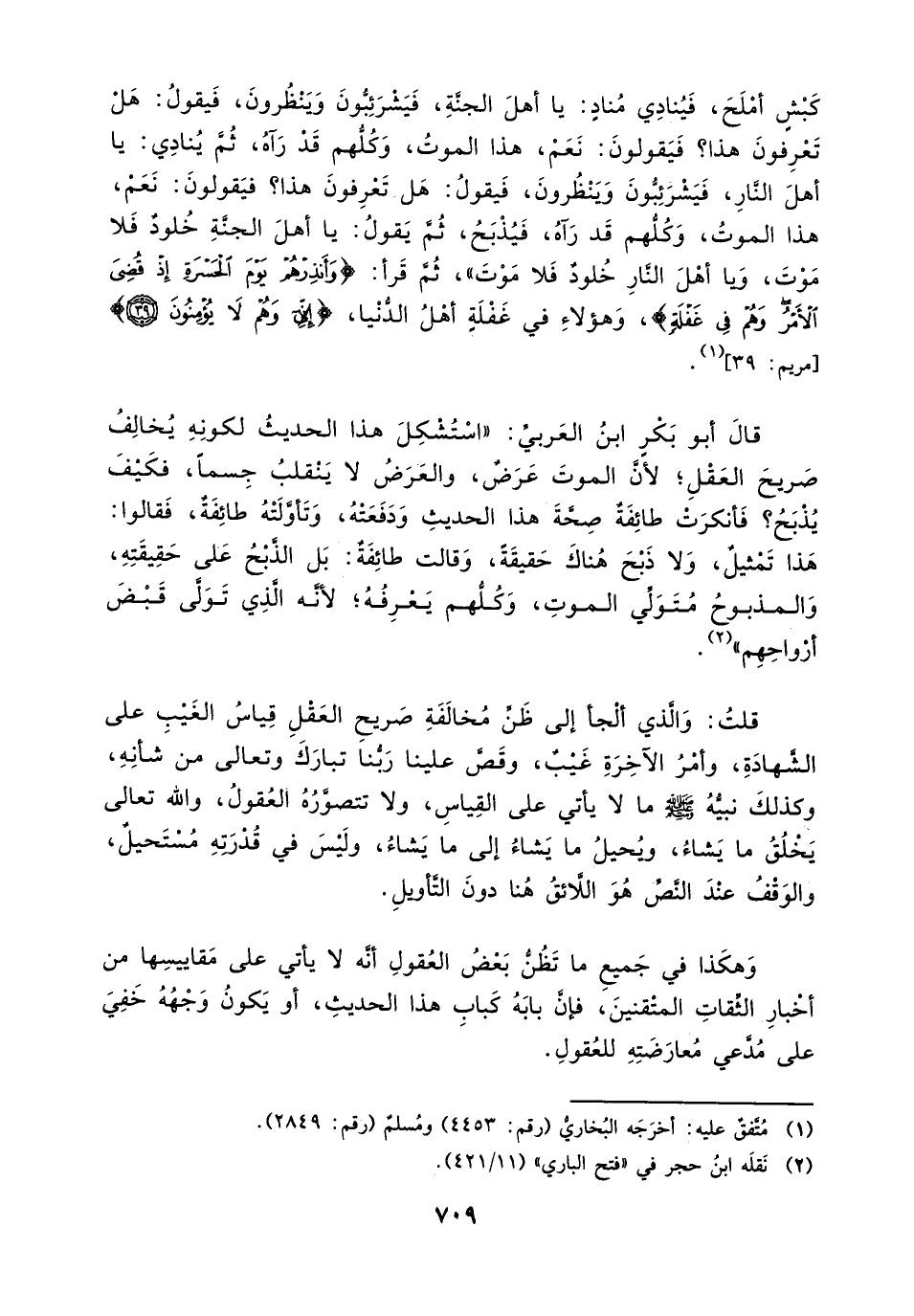 قال أبو بكر ابن العربي: " استشكل هذا الحديث لكونه يخالف صريح العقل؛ لأن الموت عرض، والعرض لا ينقلب جسما، فكيف يذبح؟ فأنكرت طائفة صحة هذا الحديث ودفعته، وتأولته طائفة، فقالوا هذا تمثيل، ولا ذبح هناك حقيقة، وقالت طائفة: بل الذبح على حقيقته، والمذبوح متولي الموت، وكلهم يعرفه؛ لأنه الذي تولى قبض أرواحهم " (¬2).