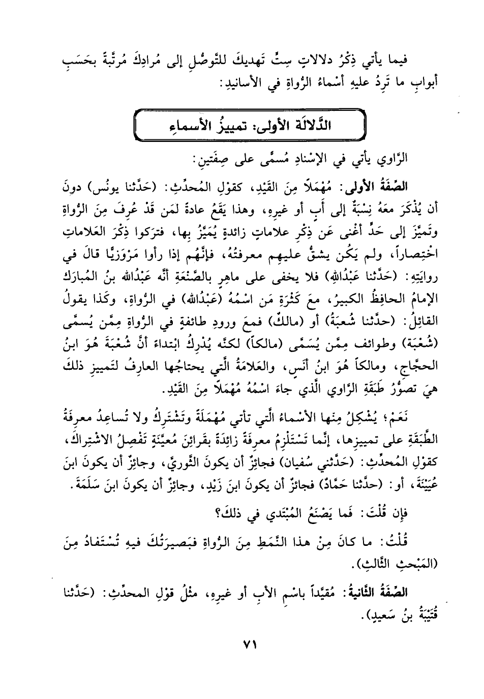 الصفة الأولى: مهملاً من القيد، كقول المحدث: (حدثنا يونس) دون أن يذكر معه نسبة إلى أب أو غيره، وهذا يقع عادة لمن قد عرف من الرواة وتميز إلى حد أغنى عن ذكر علامات زائدة يميز بها،