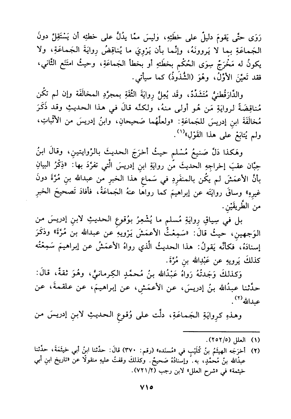 والدارقطني متشدد، وقد يعل رواية الثقة بمجرد المخالفة وإن لم تكن مناقضة لرواية من هو أولى منه، ولكنه قال في هذا الحديث وقد ذكر مخالفة ابن إدريس للجماعة: " ولعلهما صحيحان، وابن إدريس من الأثبات، ولم يتابع على هذا القول " (¬1).