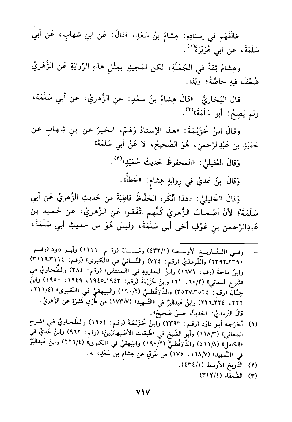 وقال الخليلي: " هذا أنكره الحفاظ قاطبة من حديث الزهري عن أبي سلمة؛ لأن أصحاب الزهري كلهم اتفقوا عن الزهري، عن حميد بن عبد الرحمن بن عوف أخي أبي سلمة، وليس هو من حديث أبي سلمة،