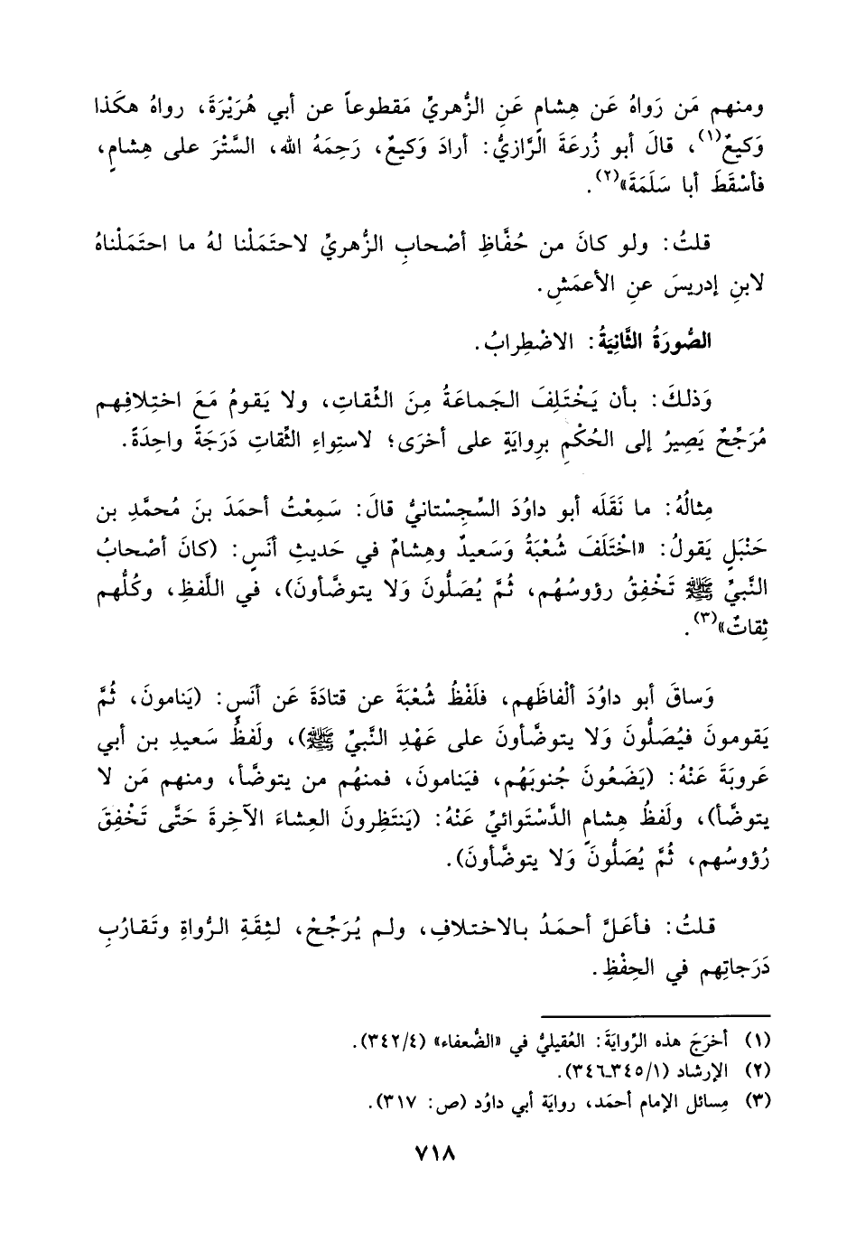 مثاله: ما نقله أبو داود السجستاني قال: سمعت أحمد بن محمد بن حنبل يقول: " اختلف شعبة وسعيد وهشام في حديث أنس: (كان أصحاب النبي صلى الله عليه وسلم تخفق رؤوسهم، ثم يصلون ولا يتوضأون)، في اللفظ، وكلهم ثقات " (¬3).