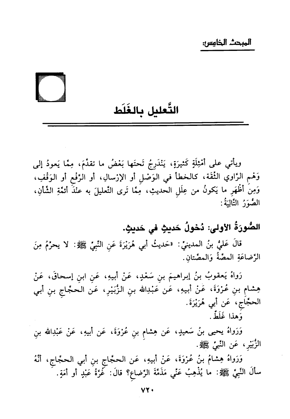 ويأتي على أمثلة كثيرة، يندرج تحتها بعض ما تقدم، مما يعود إلى وهم الراوي الثقة، كالخطأ في الوصل أو الإرسال، أو الرفع أو الوقف، ومن أظهر ما يكون من علل الحديث، مما ترى التعليل به عند أئمة الشأن الصور التالية: