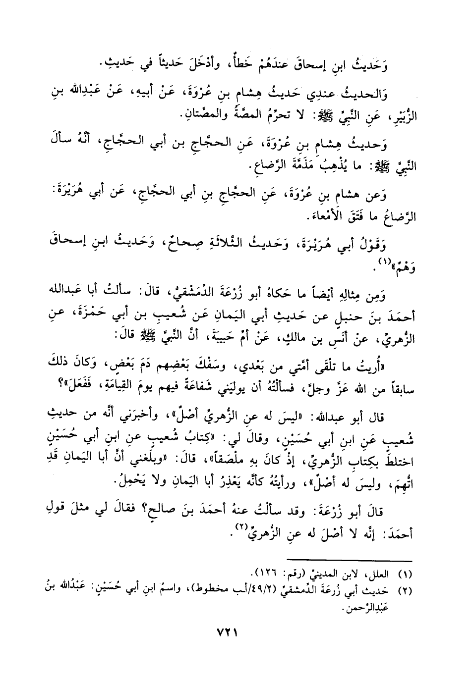ومن مثاله أيضاً ما حكاه أبو زرعة الدمشقي، قال: سألت أبا عبد الله أحمد بن حنبل عن حديث أبي اليمان عن شعيب بن أبي حمزة، عن الزهري، عن أنس بن مالك، عن أم حبيبة، أن النبي صلى الله عليه وسلم قال:
