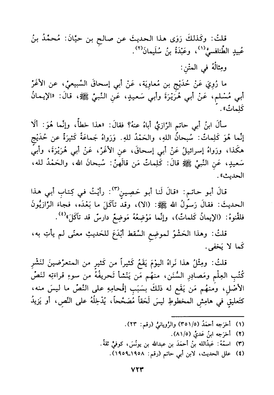 قلت: ومثل هذا نراه اليوم يقع كثيراً من كثير من المتعرضين لنشر كتب العلم ومصادر السنن، منهم من ينشأ تحريفه من سوء قراءته لنص الأصل، ومنهم من يقع له ذلك بسبب إقحامه على النص ما ليس منه، كتعليق في هامش المخطوط ليس لحقاً مصححاً، يدخله على النص، أو يزيد
