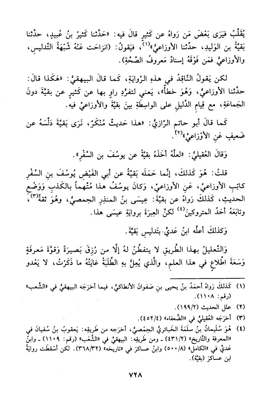 لكن يقول الناقد في هذه الرواية، كما قال البيهقي: " هكذا قال: حدثنا الأوزاعي، وهو خطأ "، يعني لتفرد راو بها عن كثير عن بقية دون الجماعة، مع قيام الدليل على الواسطة بين بقية والأوزاعي فيه.