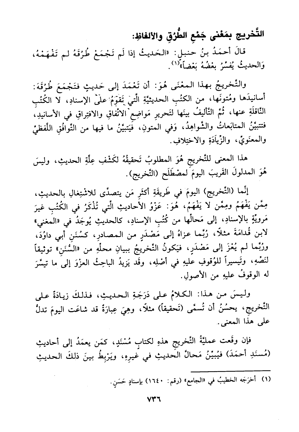 إنما (التخريج) اليوم في طريقة أكثر من يتصدى للاشتغال بالحديث، ممن يفهم وممن لا يفهم، هو: عزو الأحاديث التي تذكر في الكتب غير مروية بالإسناد، إلى محالها من كتب الإسناد، كالحديث يوجد في " المغني " لابن قدامة مثلاً، ربما عزاه إلى مصدر من المصادر، كسنن أبي داود، وربما لم يعز إلى مصدر، فيكون التخريج ببيان محله من " السنن " توثيقاً لنصه، وتيسيراً للوقوف عليه في أصله، وقد يزيد الباحث العزو إلى ما تيسر له الوقوف عليه من الأصول.