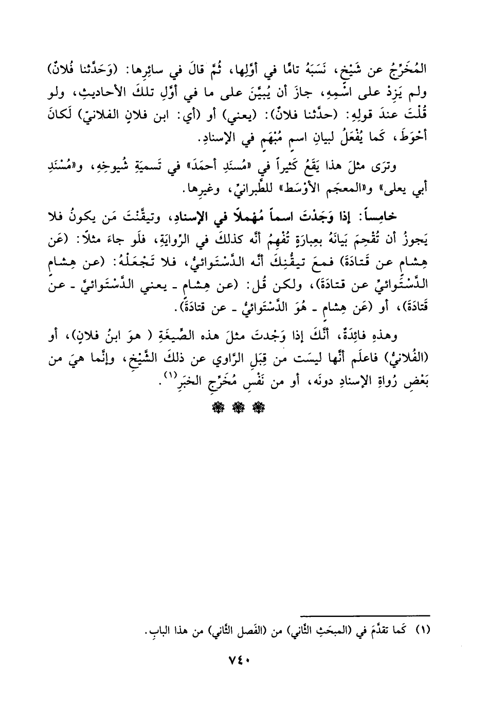 خامساً: إذا وجدت اسماً مهملاً في الإسناد، وتيقنت من يكون فلا يجوز أن تقحم بيانه بعبارة تفهم أنه كذلك في الرواية، فلو جاء مثلاً: (عن هشام عن قتادة) فمع تيقنك أنه الدستوائي، فلا تجعله: (عن هشام الدستوائي عن قتادة)، ولكن قل: (عن هشام _ يعني الدستوائي _ عن قتادة)، أو (عن هشام _ هو الدستوائي _ عن قتادة).