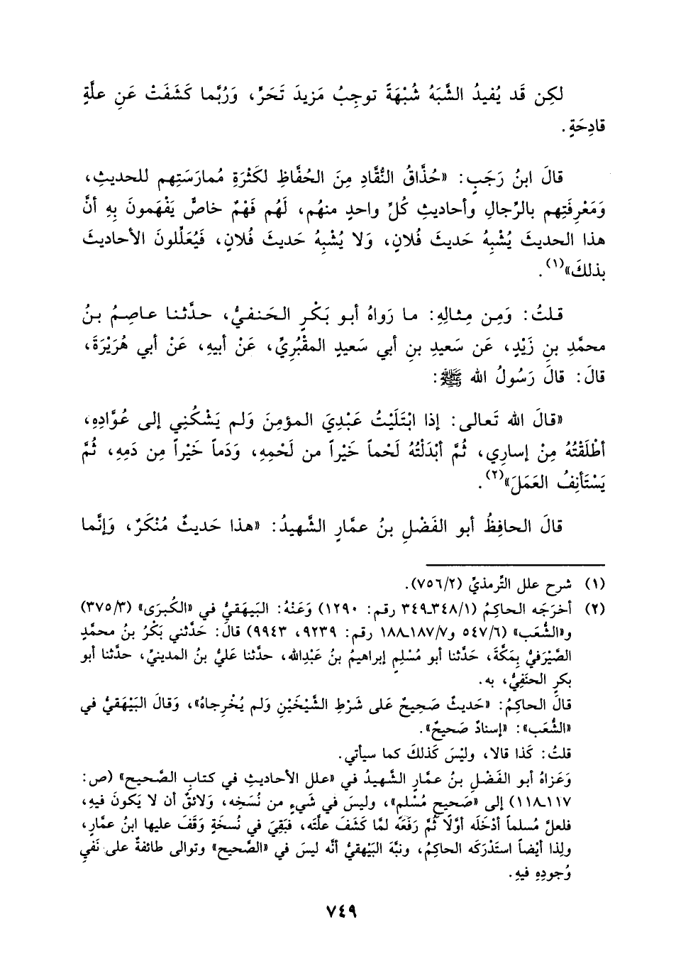 وعزاه أبو الفَضل بن عمار الشهيد في " علل الأحاديث في كتاب التصحيح " (ص: 117 _ 118) إلى " صحيح مسلم "، وليس في شيء من نُسخه، ولائقٌ أن لا يكون فيه، فلعل مسلماً أدخله أولاً ثم رفعه لما كشف علته، فبقي في نُسخة وقف عليها ابنُ عمار، ولذا أيضاً استدركه الحاكم، ونبّه البيهقي أنه ليس في " الصحيح " وتوالى طائفة على نفيِ وُجوده فيه.