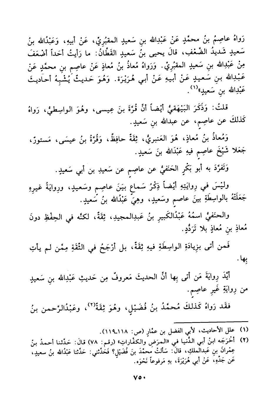 أيد رواية من أتى بها أن الحديث معروف من حديث عبد الله بن سعيد من رواية غير عاصم. فقد رواه كذلك محمد بن فضيل، وهو ثقة (¬2)، وعبد الرحمن بن