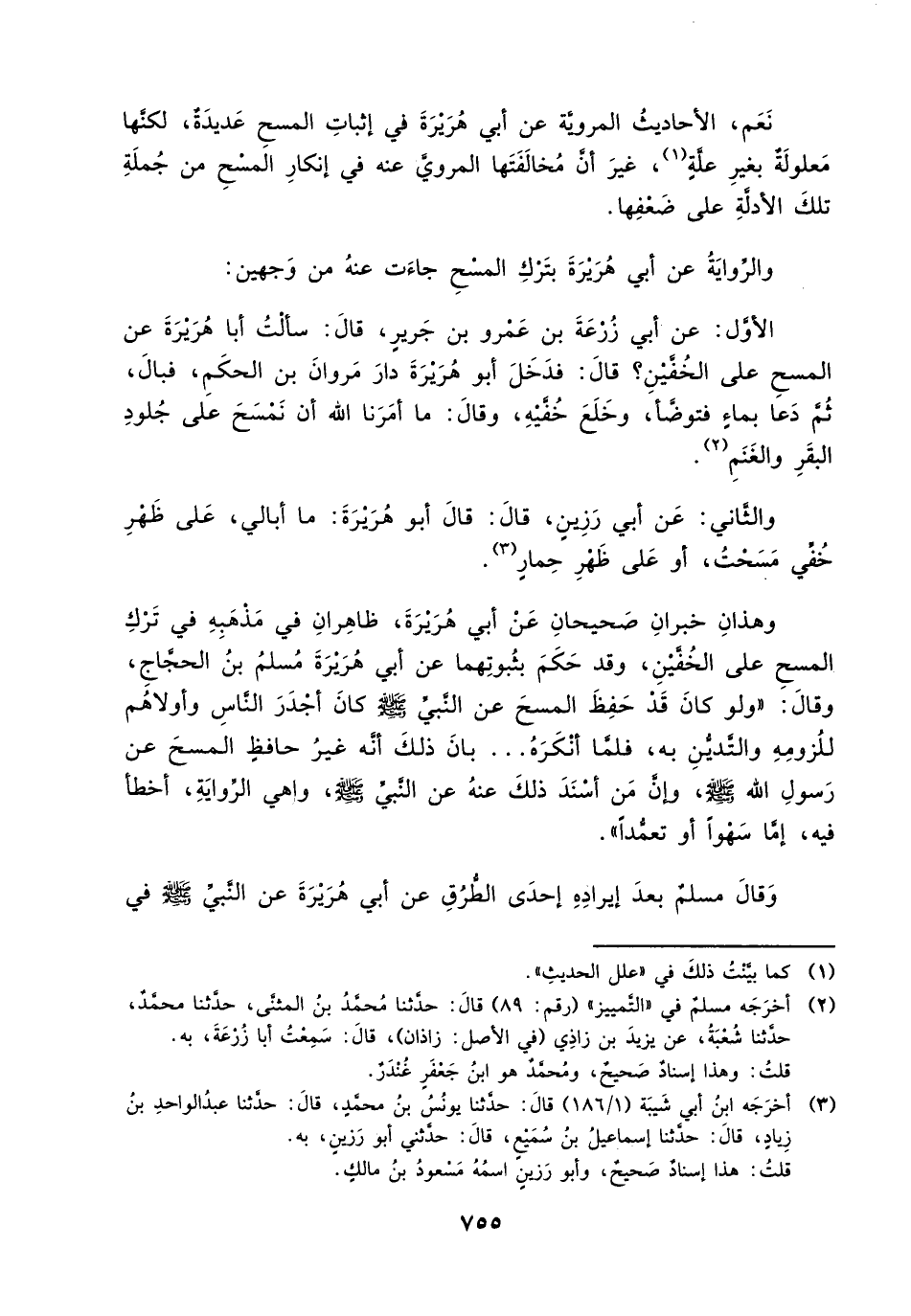 وهذان خبران صحيحان عن أبي هريرة، ظاهران في مذهبه في ترك المسح على الخفين، وقد حكم بثبوتها عن أبي هريرة مسلم بن الحجاج، وقال: " ولو كان قد حفظ المسح عن النبي صلى الله عليه وسلم كان أجدر الناس وأولاهم للزومه والتدين به، فلما أنكره. . . بان ذلك أنه غير حافظ المسح عن رسول الله صلى الله عليه وسلم، وإن من أسند ذلك عنه عن النبي صلى الله عليه وسلم، واهي الراوية، أخطأ فيه إما سهواً أر تعمداً ".