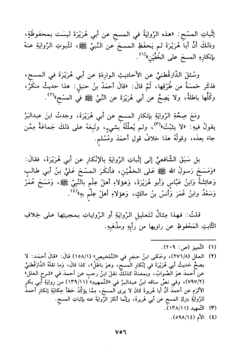 (¬2) العلل (8/ 276)، وحكي ابنُ حجر في " التلخيص " (1/ 158) قال: " قال أحمد: لا يصحُّ حديث أبي هريرة في إنكار المسح، وهو باطلٌ "، كذا قال، وما نقله الدارقطني عن أحمد هوَ الصواب، وبمعناه كذلك نقل ابنُ رجبٍ عن أحمد في " شرح العلل " (2/ 797)، وفي نصٍّ ساقه ابنُ عبد البر في " التمهيد " (11/ 139) من رواية أبي بكر الأثرم عن أحمد أنَّ أبا هريرة كانَ لا يرى المسح، مما يوكِّدُ خطأ حِكاية إنكار أحمد للرواية بترك المسح عن أبي هريرة، وإنما أنكر الرواية عنه بإثبات المسح.