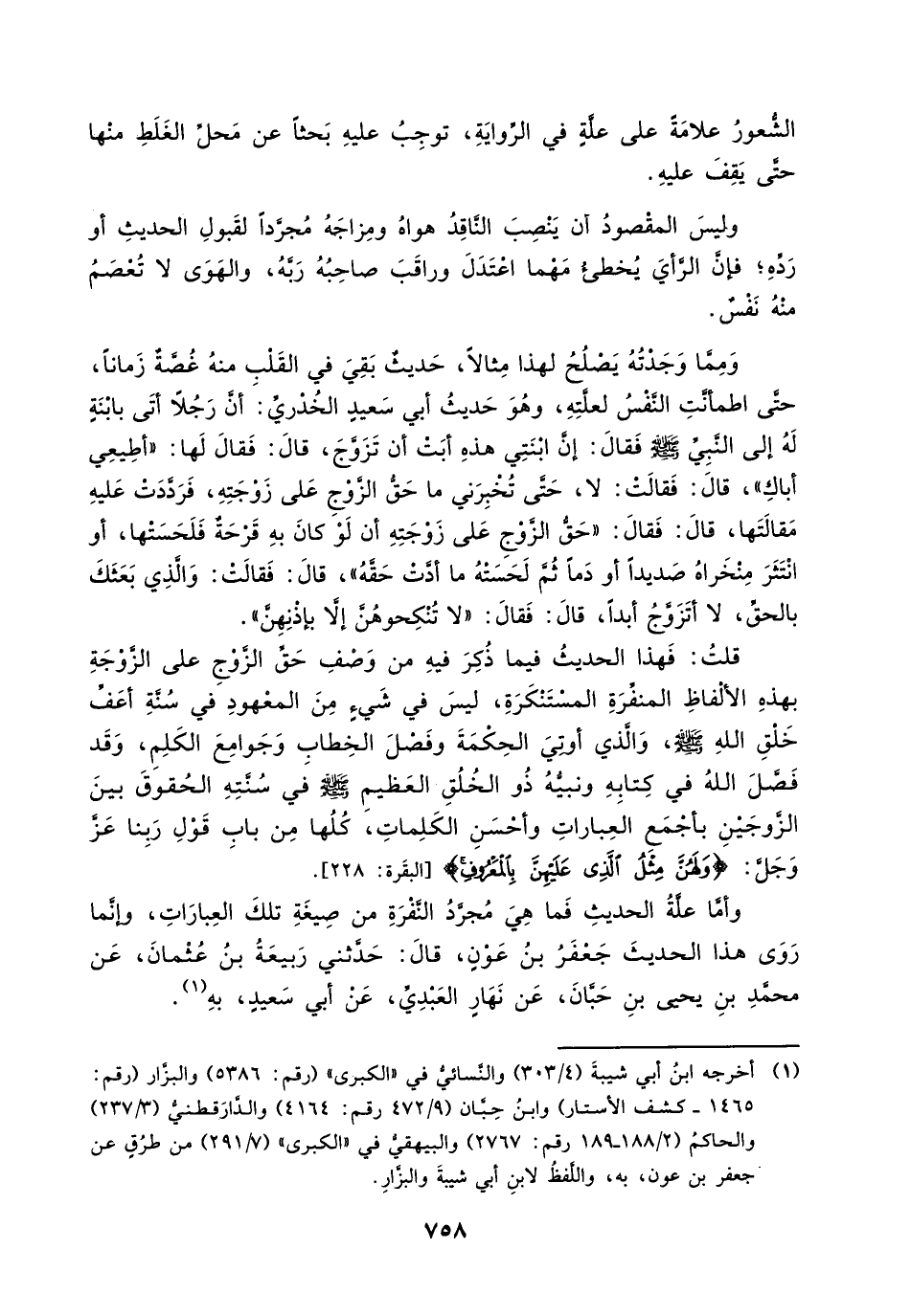ومما وجدته يصلح لهذا مثالاً، حديث بقي في القلب منه غصة زماناً، حتى اطمأنت النفس لعلته، وهو حديث أبي سعيد الخدري: أن رجلاً أتى بابنة له إلى النبي صلى الله عليه وسلم فقال: إن ابنتي هذه أبت أن تزوج، قال: فقال لها: " أطيعي أباك "، قال: فقالت: لا، حتى تخبرني ما حق الزوج على زوجته، فرددت عليه مقالتها، قال: فقال: " حق الزوج على زوجته أن لو كان به قرحة فلحستها، أو انتثر منخراه صديداً أو دماً ثم لحسته ما أدت حقه "، قال: فقالت: والذي بعثك بالحق، لا أتزوج أبداً، قال: فقال: " لا تنكحوهن إلا بإذنهن ".
