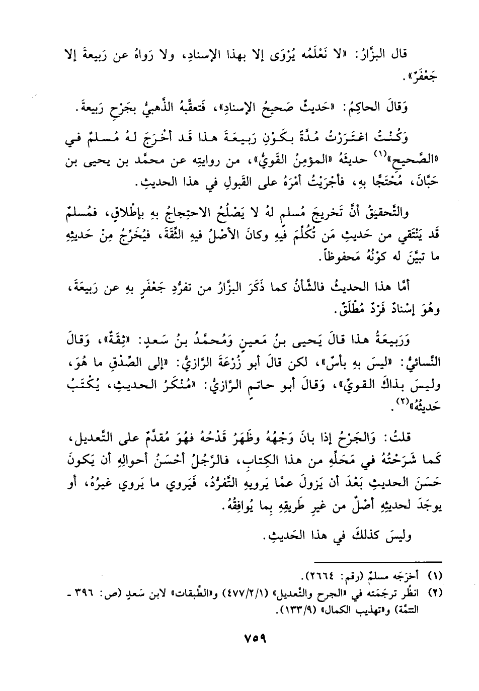 أما هذا الحديث فالشأن كما ذكر البزار من تفرد جعفر به عن ربيعة، وهو إسناد فرد مطلق.
