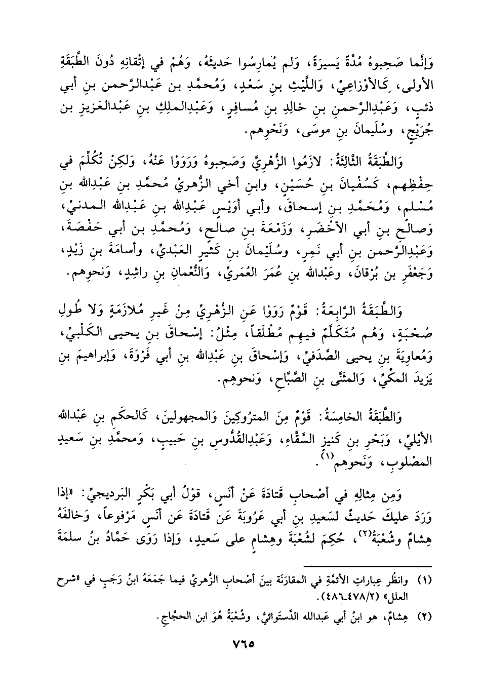 والطبقة الرابعة: قوم رووا عن الزهري من غير ملازمة ولا طول صحبة، وهم متكلم فيهم مطلقاً، مثل: إسحاق بن يحيى الكلبي، ومعاوية بن يحيى الصدفي، وإسحاق بن عبد الله بن أبي فروة، وإبراهيم بن يزيد المكي، والمثنى بن الصباح، ونحوهم.