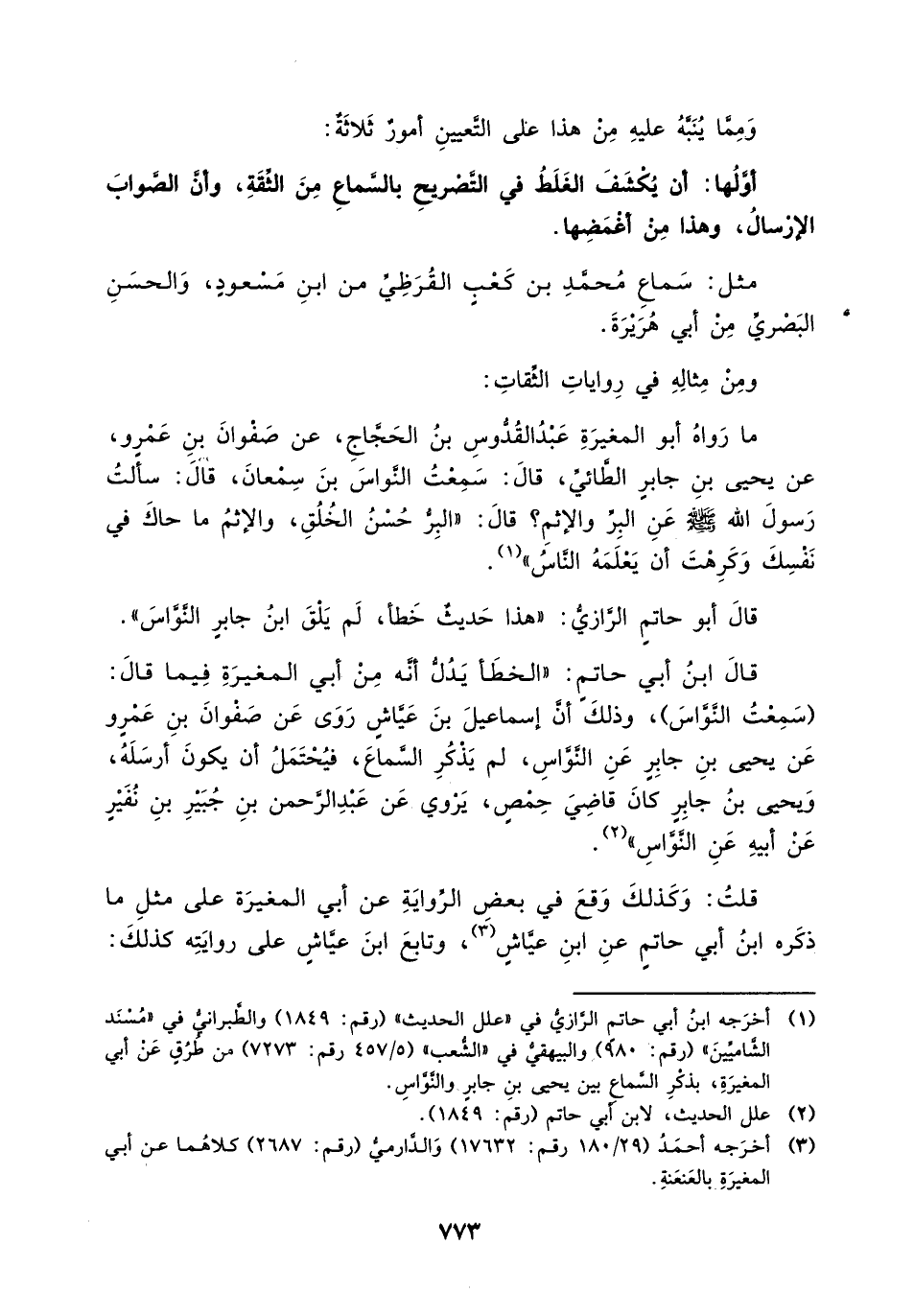 قال ابن أبي حاتم: " الخطأ يدل أنه من أبي المغيرة فيما قال: (سمعت النواس)، وذلك أن إسماعيل بن عياش روى عن صفوان بن عمرو عن يحيى بن جابر عن النواس، لم يذكر السماع، فيحتمل أن يكون أرسله، ويحيى بن جابر كان قاضي حمص، يروي عن عبد الرحمن بن جبير بن نفير عن أبيه عن النواس " (¬2).
