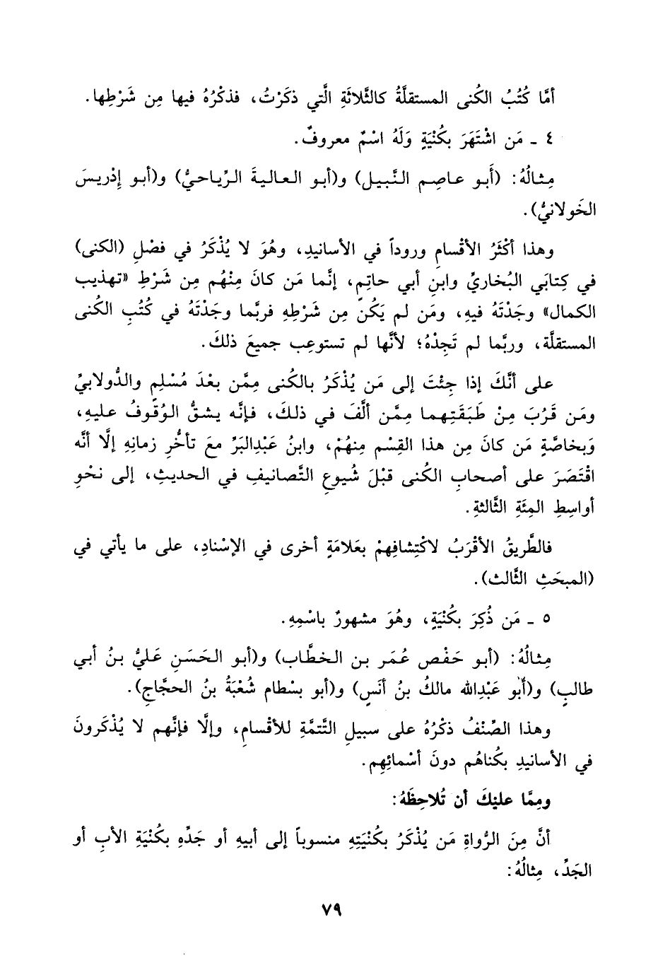 مثاله: (أبو حفص عمر بن الخطاب) و (أبو الحسن علي بن أبي طالب) و (أبو عبد الله بن مالك بن أنس) و (أبو بسطام شعبة بن الحجاج).