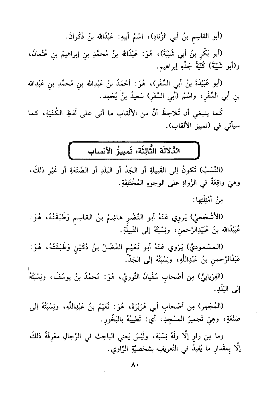 (النسب) تكون إلى قبيلة أو الجد أو البلد أو الصنعة أو غير ذلك، وهي واقعة في الرواة على الوجوه المختلفة.