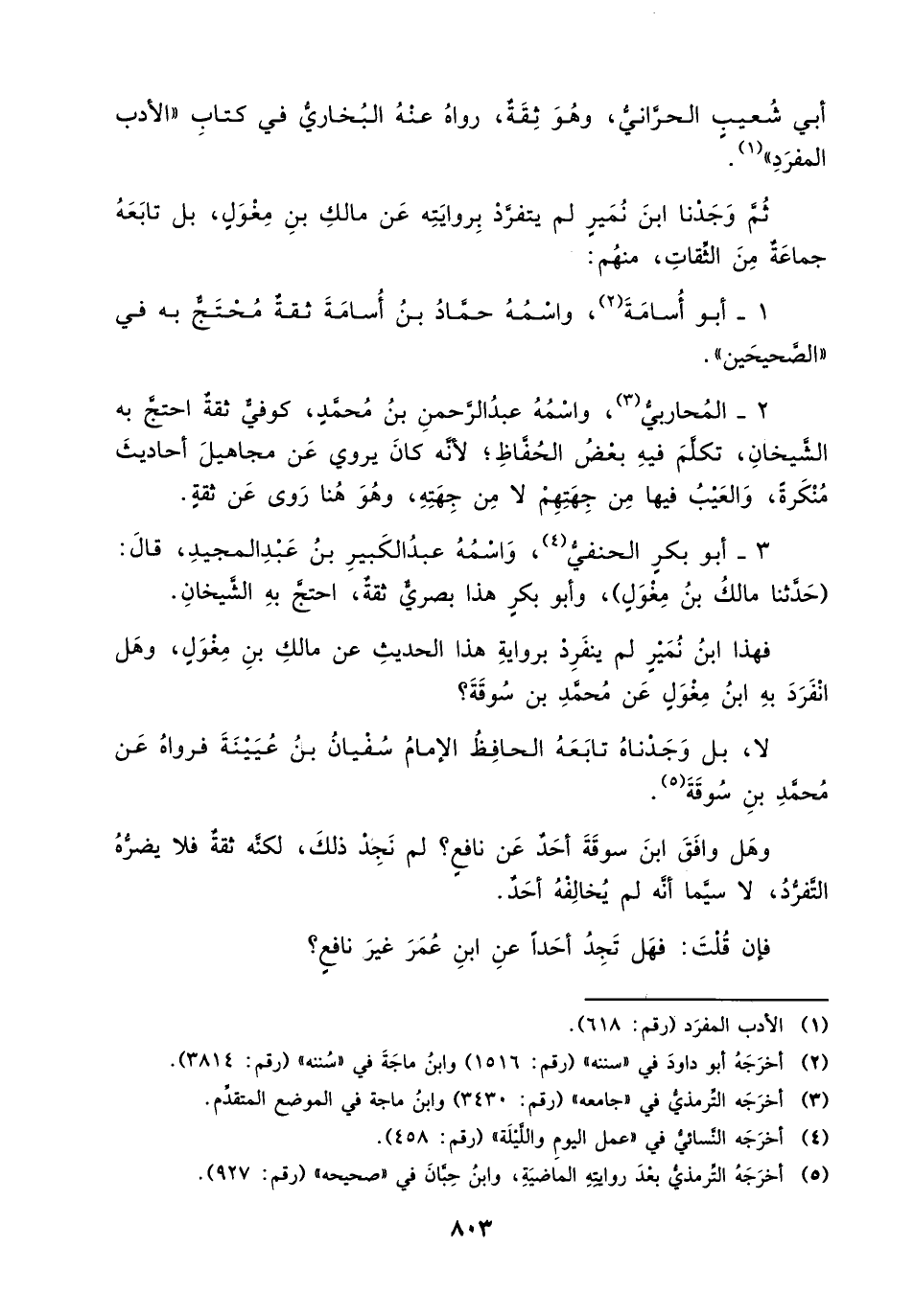وهل وافق ابن سوقة أحد عن نافع؟ لم نجد ذلك، لكنه ثقة فلا يضره التفرد، لا سيما أنه لم يخالفه أحد.