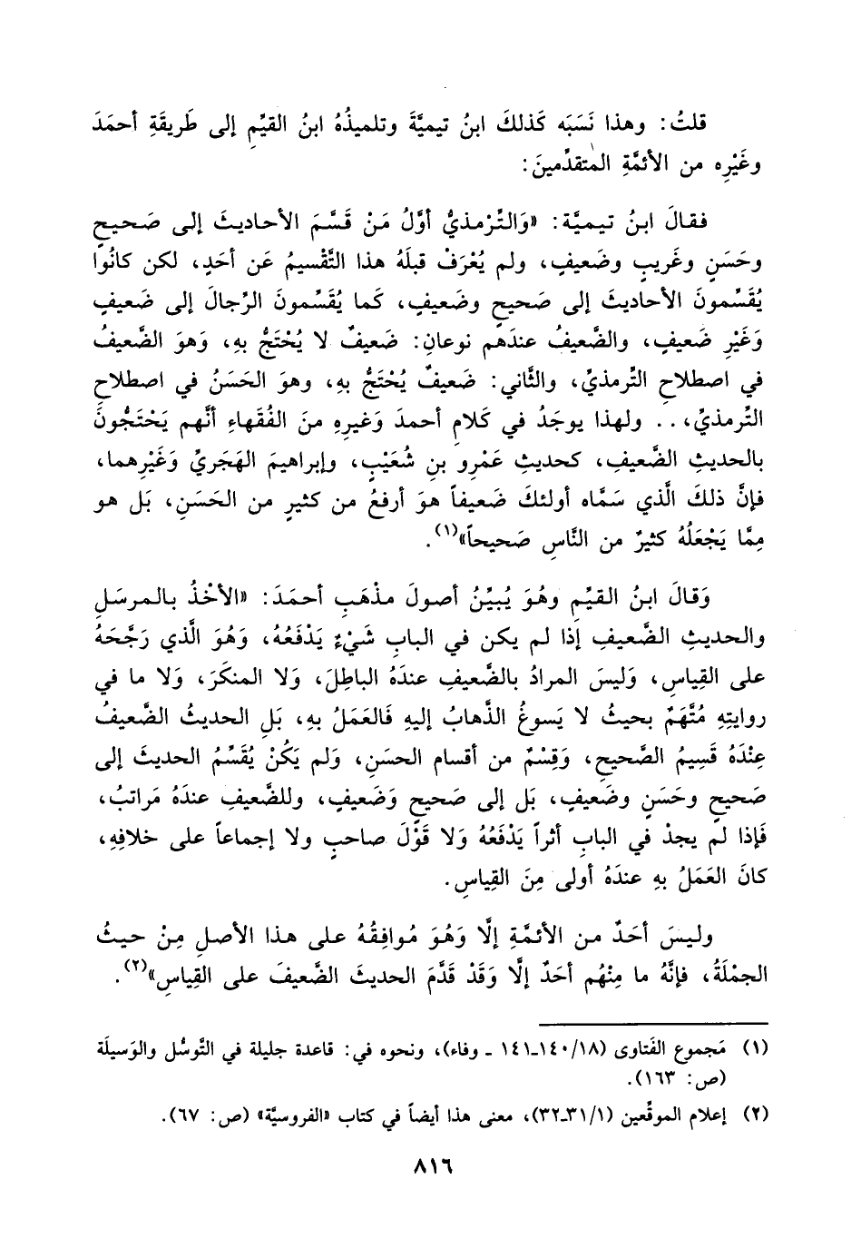 قلت: وهذا نسبه كذلك ابن تيمية وتلميذه ابن القيم إلى طريقة أحمد وغيره من الأئمة المتقدمين: