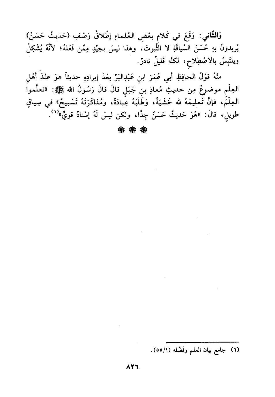 منه قول الحافظ أبي عمر ابن عبد البر بعد إيراده حديثاً هو عند أهل العلم موضوع من حديث معاذ بن جبل قال قال رسول الله صلى الله عليه وسلم: " تعلموا العلم، فإن تعليمه لله خشية، وطلبه عبادة، ومذاكرته تسبيح " في سياق طويل، قال: " هو حديث حسن جداً، ولكن ليس له إسناد قوي " (¬1).