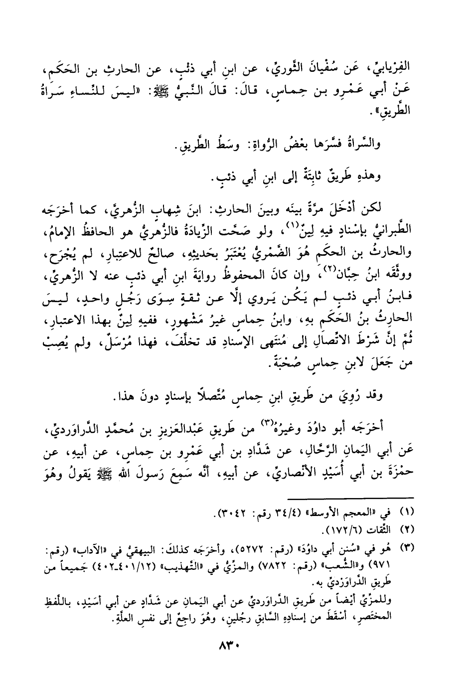 الفريابي، عن سفيان الثوري، عن ابن أبي ذئب، عن الحارث بن الحكم، عن أبي عمرو بن حماس، قال: قال النبي صلى الله عليه وسلم: " ليس للنساء سراة الطريق ".