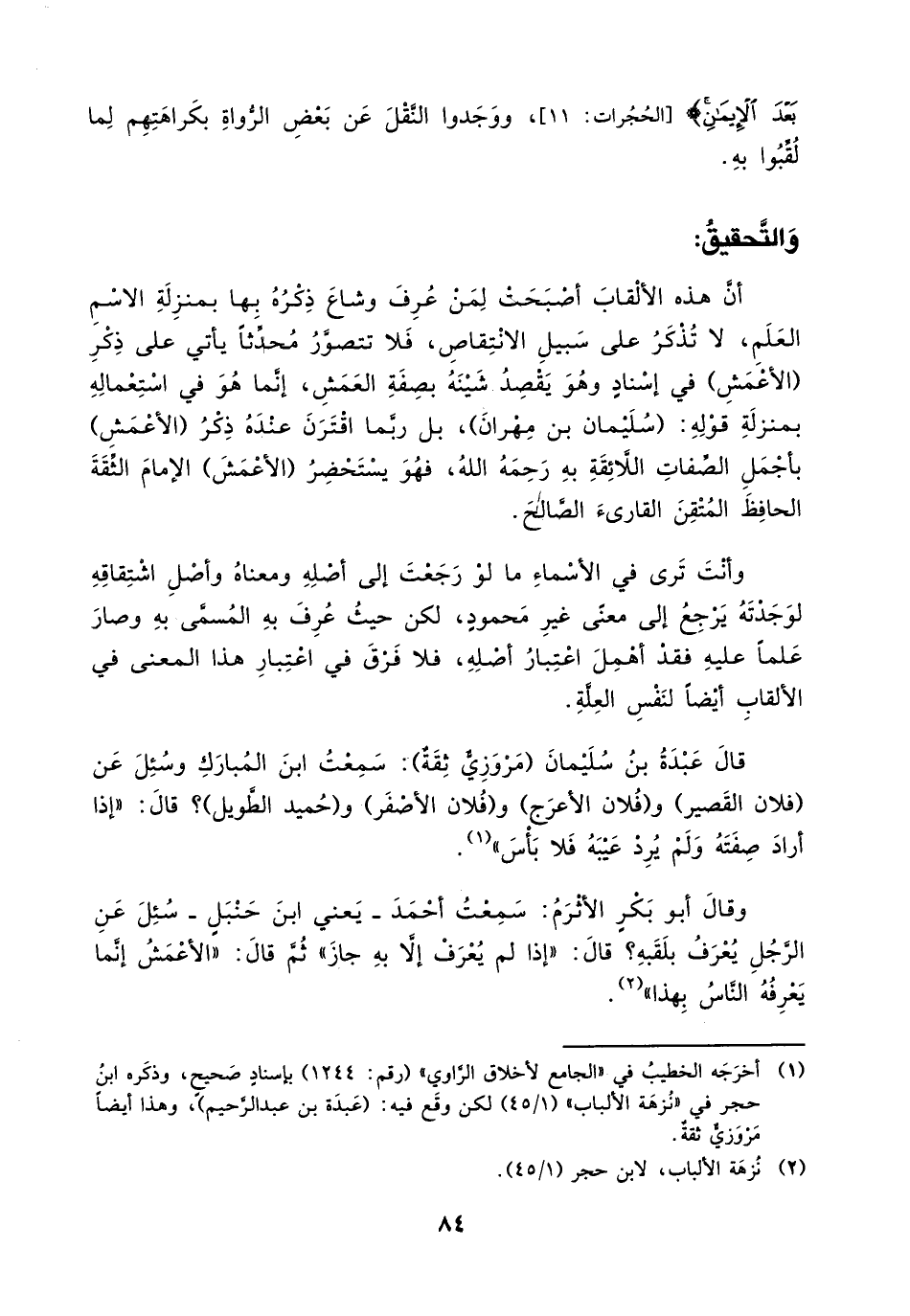أن هذه الألقاب أصبحت لمن عرف وشاع ذكره بها بمنزلة الاسم العلم، لا تذكر على سبيل الانتقاص، فلا تتصور محدثاً يأتي على ذكر (الأعمش) في إسناد وهو يقصد شينه بصفة العمش، إنما هو في استعماله بمنزلة قوله: (سليمان بن مهران)، بل ربما اقترن عنده ذكر (الأعمش) بأجمل الصفات اللائقة به رحمه الله، فهو يستحضر (الأعمش) الأمام الثقة الحافظ المتقن القارىء الصالح.