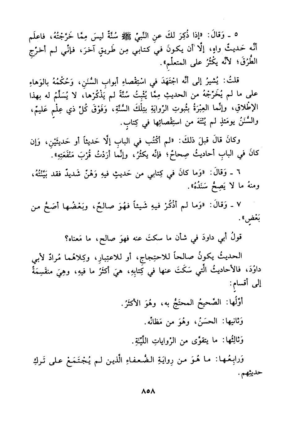 الحديث يكون صالحاً للاحتجاج، أو للاعتبار، وكلاهما مراد لأبي داود، فالأحاديث التي سكت عنها في كتابه، هي أكثر ما فيه، وهي منقسمة إلى أقسام: