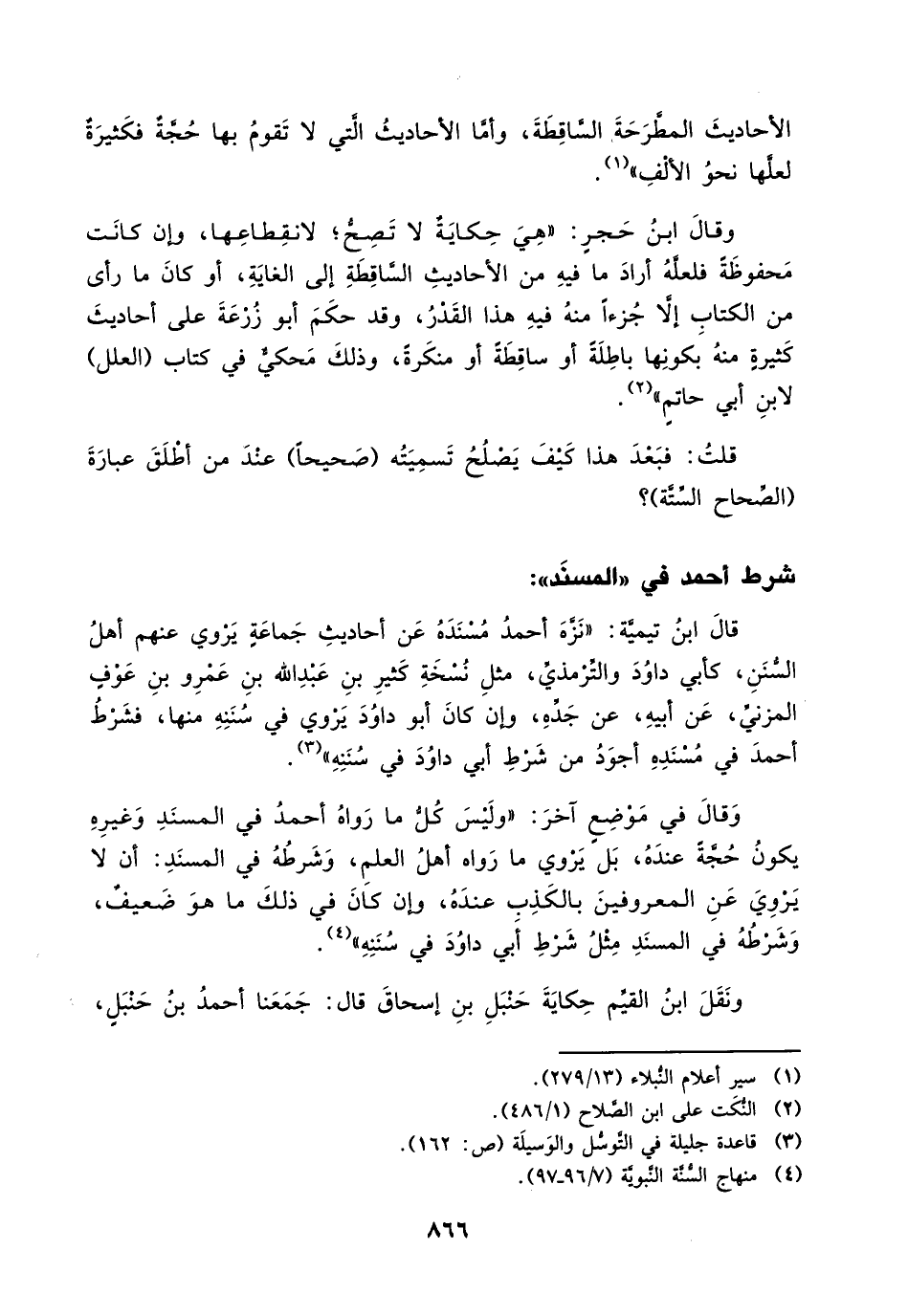 وقال في موضع آخر: " وليس كل ما رواه أحمد في المسند وغيره يكون حجة عنده، بل يروي ما رواه أهل العلم، وشرطه في المسند: أن لا يروي عن المعروفين بالكذب عنده، وإن كان في ذلك ما هو ضعيف، وشرطه في المسند مثل شرط أبي داود في سننه " (¬4).