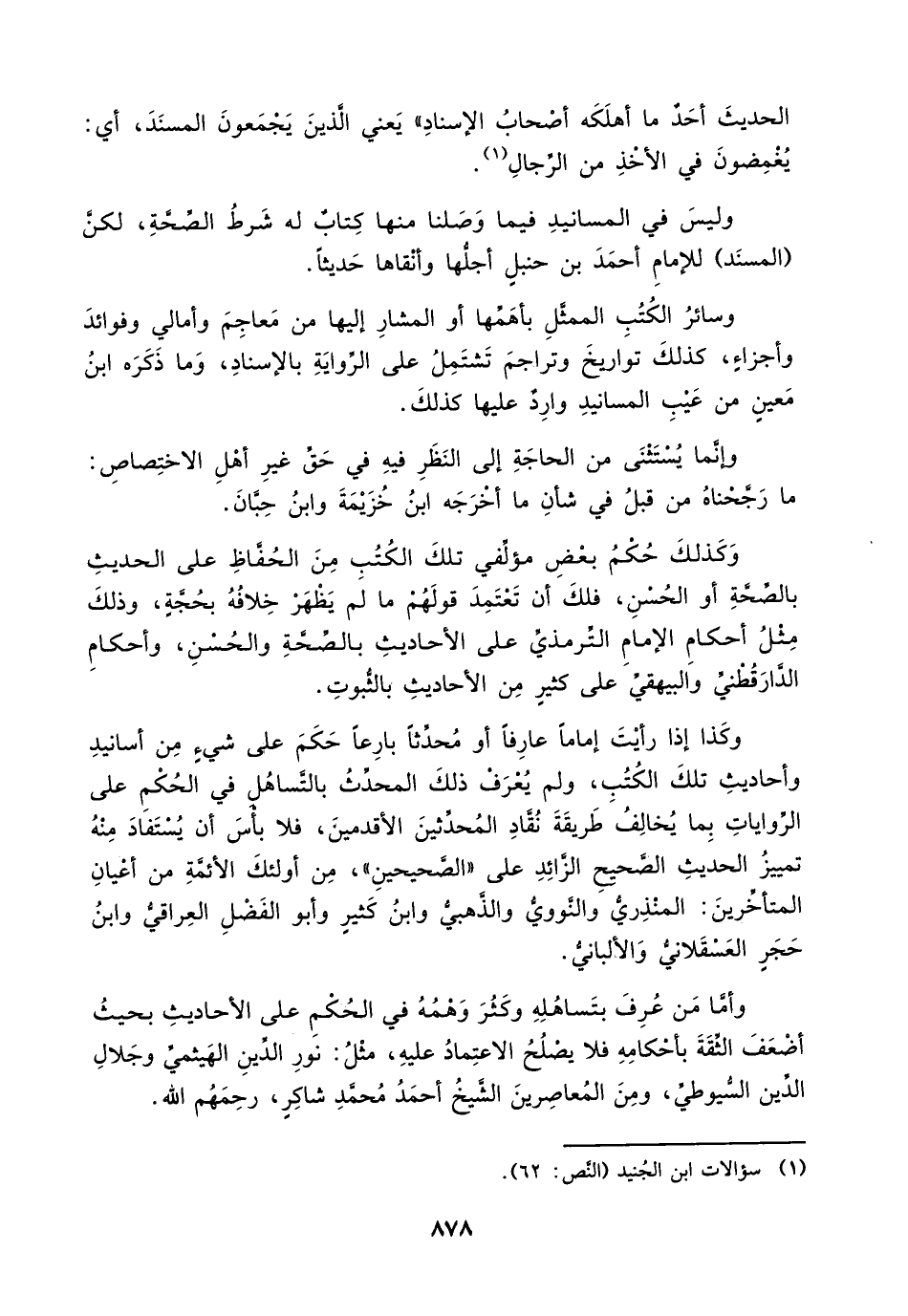 وكذا إذا رأيت إماماً عارفاً أو محدثاً بارعاً حكم على شيء من أسانيد وأحاديث تلك الكتب، ولم يعرف ذلك المحدث بالتساهل في الحكم على الروايات بما يخالف طريقة نقاد المحدثين الأقدمين، فلا بأس أن يستفاد منه تمييز الحديث الصحيح الزائد على " الصحيحين "، من أولئك الأئمة من أعيان المتأخرين: المنذري والنووي والذهبي وابن كثير وأبو الفضل العراقي وابن حجر العسقلاني والألباني.