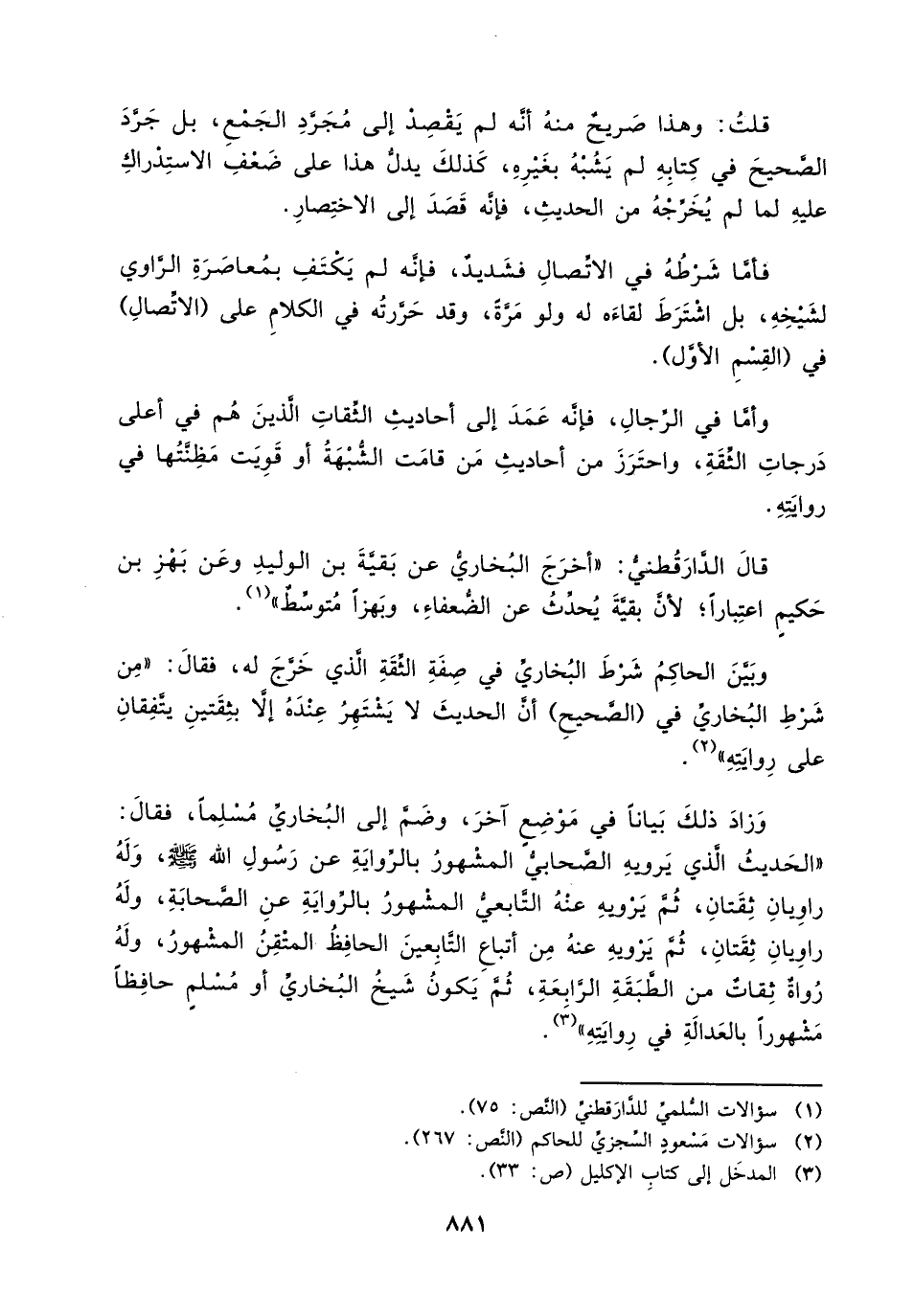 وزاد ذلك بياناً في موضع آخر، وضم إلى البخاري مسلماً، فقال: " الحديث الذي يرويه الصحابي المشهور بالرواية عن رسول الله صلى الله عليه وسلم، وله راويان ثقتان، ثم يرويه عنه التابعي المشهور بالرواية عن الصحابة، وله راويان ثقتان، ثم يرويه عنه من أتباع التابعين الحافظ المتقن المشهور، وله رواة ثقات من الطبقة الرابعة، ثم يكون شيخ البخاري أو مسلم حافظاً مشهوراً بالعدالة في روايته " (¬3).