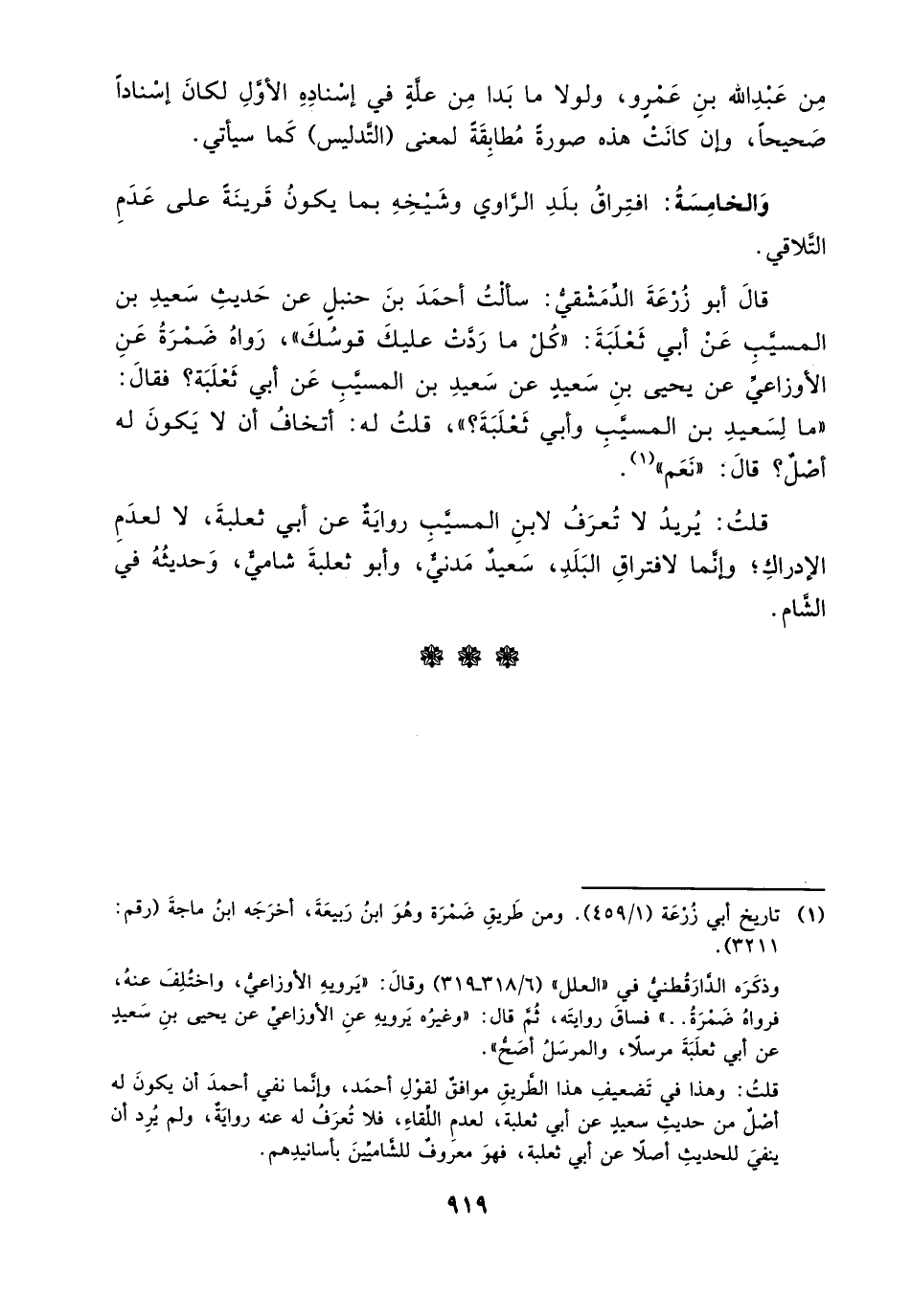 قال أبو زرعة الدمشقي: سألت أحمد بن حنبل عن حديث سعيد بن المسيب عن أبي ثعلبة: " كل ما ردت عليك قوسك "، رواه ضمرة عن الأوزاعي عن يحيى بن سعيد بن المسيب عن أبي ثعلبة؟ فقال: " ما لسعيد بن المسيب وأبي ثعلبة؟ "، قلت له: أتخاف أن لا يكون له أصل؟ قال: " نعم " (¬1).